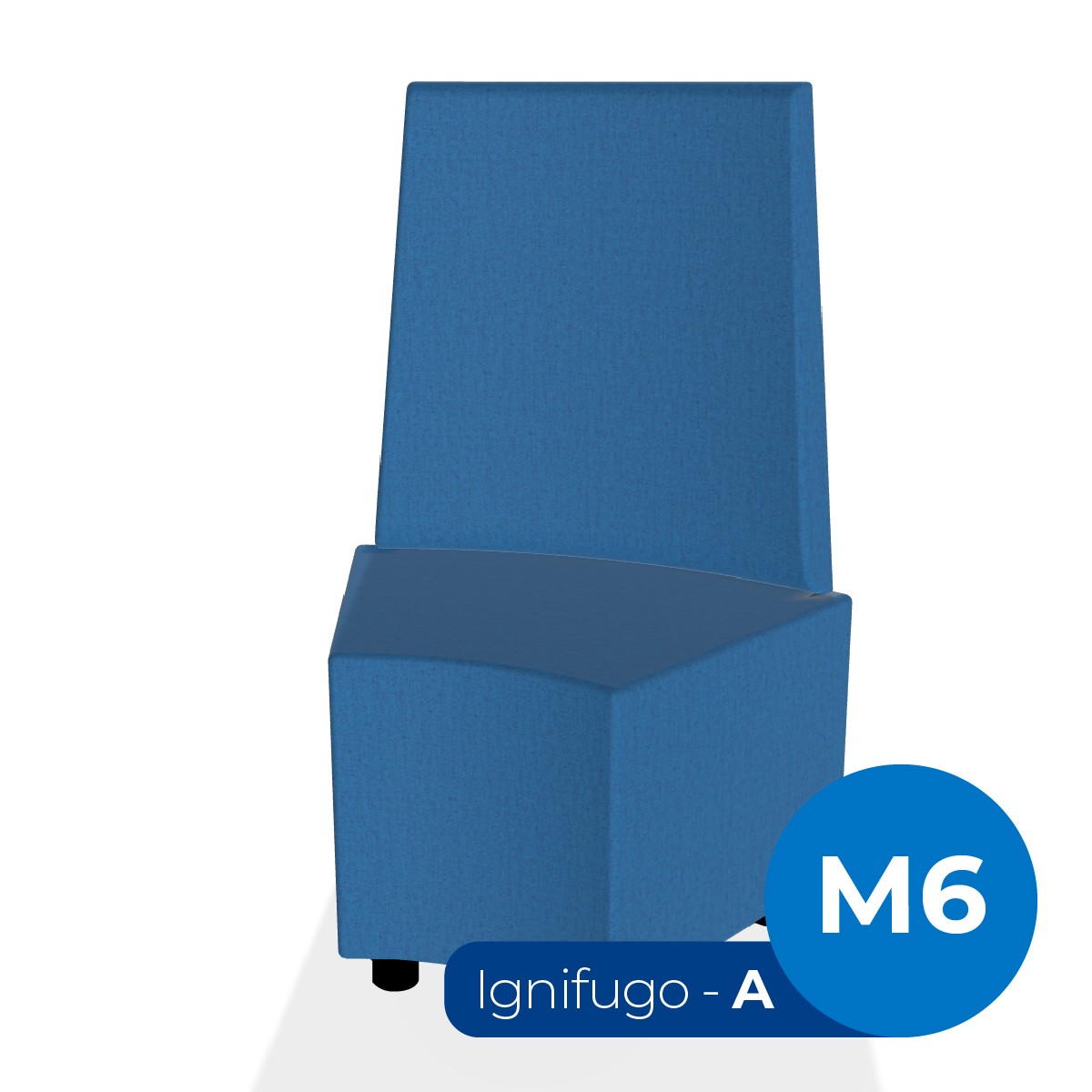 Pouf componibile di forma angolare altezza M6 e schienale alto. Dimensioni: profondità 48cm, raggio esterno 95 cm, altezza da terra 109,5cm, altezza seduta 45,5cm, piedini alla base da 6cm. Compatibile per sistema di aggancio unione elementi. Materiale: rivestimento sfoderabile, tessuto ignifugo colore di tipo "A" blu chiaro, struttura in legno, imbottitura in gomma. La caratteristica chiave di questa linea è la modularità assoluta. E’ possibile infatti creare illimitate combinazioni abbinando le diverse forme dei moduli Flora, al fine di dividere gli ambienti e arricchire gli spazi comuni. Prodotto pensato per gli spazi comuni quali atrii, corridoi ed altre aree di passaggio.