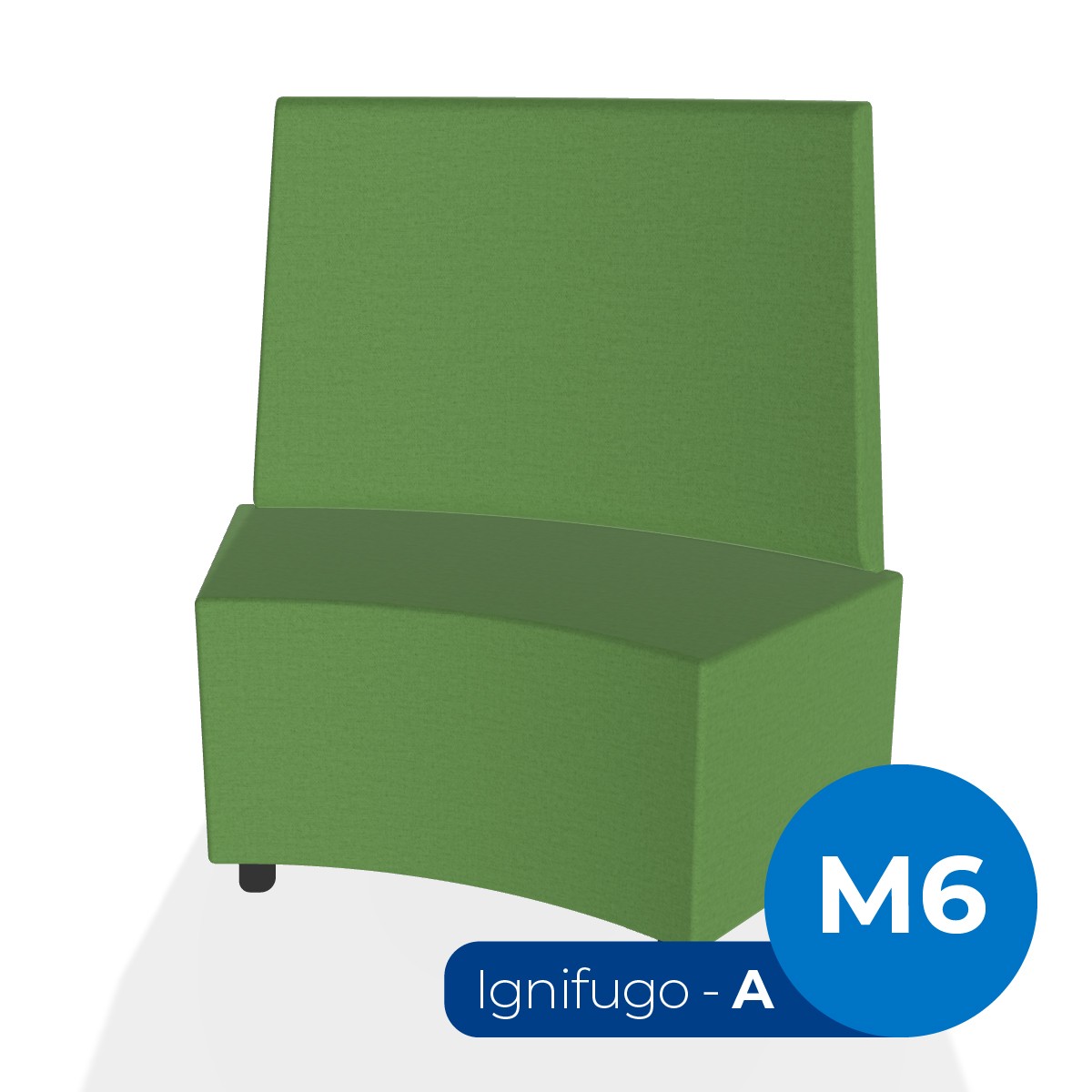 Pouf componibile di forma angolare altezza M6 e schienale alto. Dimensioni: profondità 48cm, raggio esterno 140cm, altezza da terra 109,5cm, altezza seduta 45,5cm, piedini alla base da 6 cm. Compatibile per sistema di aggancio unione elementi. Materiale: rivestimento sfoderabile, tessuto ignifugo colore di tipo "A" verde, struttura in legno, imbottitura in gomma. La caratteristica chiave di questa linea è la modularità assoluta. E’ possibile infatti creare illimitate combinazioni abbinando le diverse forme, al fine di dividere gli ambienti e arricchire gli spazi comuni. Prodotto pensato per gli spazi comuni quali atrii, corridoi ed altre aree di passaggio.