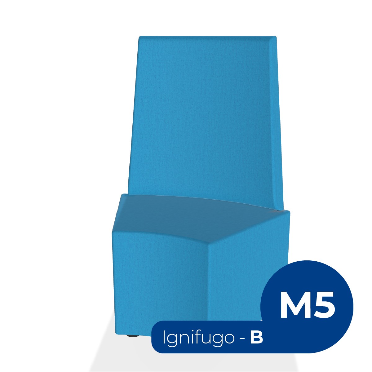 Pouf componibile di forma angolare altezza M5 e schienale alto. Dimensioni: profondità 48cm, raggio esterno 95cm, altezza da terra 106cm, altezza seduta 42cm, piedini alla base da 2,5 cm. Compatibile per sistema di aggancio unione elementi. Materiale: rivestimento sfoderabile, tessuto ignifugo colore di tipo "B" ciano, struttura in legno, imbottitura in gomma. La caratteristica chiave di questa linea è la modularità assoluta. E’ possibile infatti creare illimitate combinazioni abbinando le diverse forme, al fine di dividere gli ambienti e arricchire gli spazi comuni. Prodotto pensato per gli spazi comuni quali atrii, corridoi ed altre aree di passaggio.