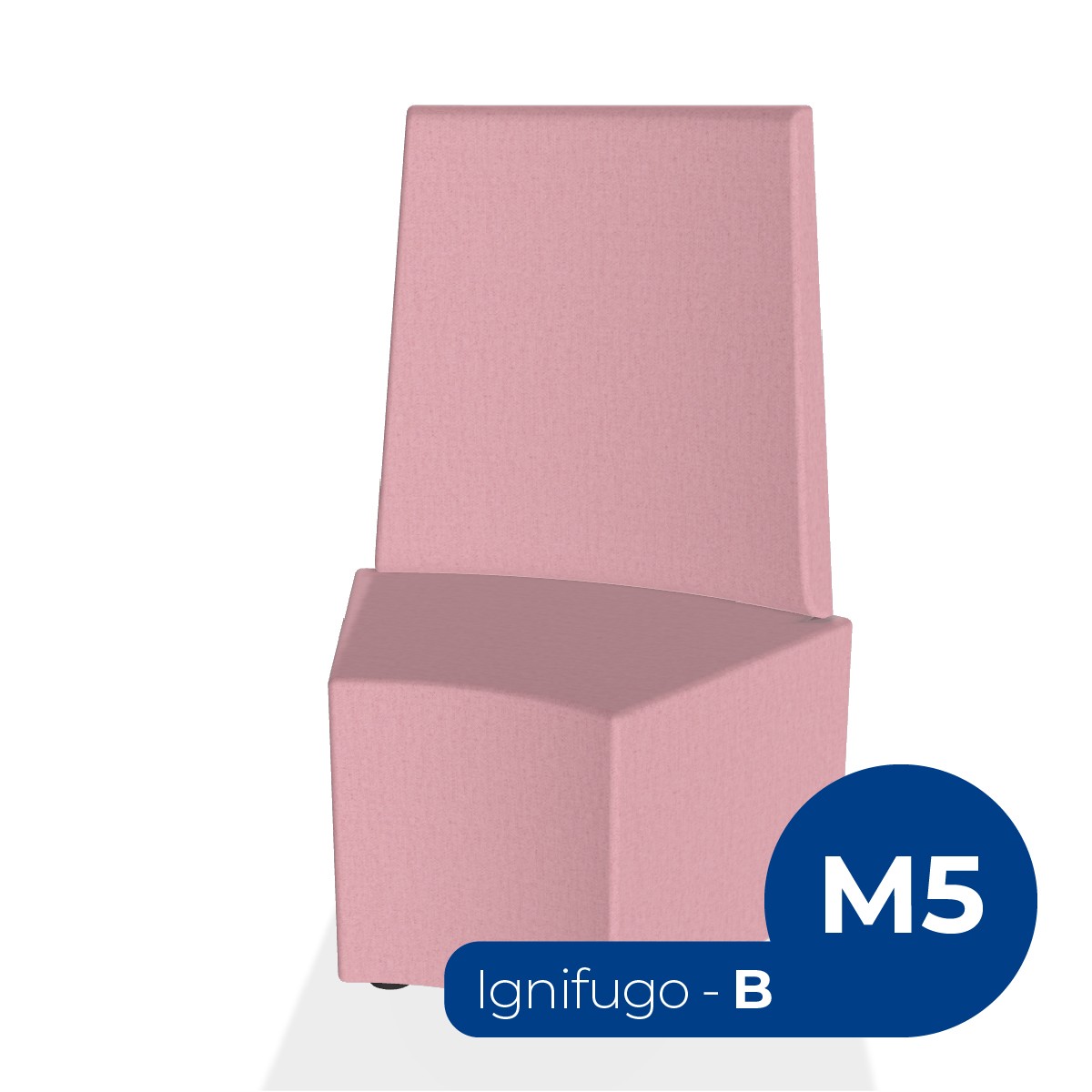 Pouf componibile di forma angolare altezza M5 e schienale alto. Dimensioni: profondità 48cm, raggio esterno 95cm, altezza da terra 106cm, altezza seduta 42cm, piedini alla base da 2,5 cm. Compatibile per sistema di aggancio unione elementi. Materiale: rivestimento sfoderabile, tessuto ignifugo colore di tipo "B" rosa, struttura in legno, imbottitura in gomma. La caratteristica chiave di questa linea è la modularità assoluta. E’ possibile infatti creare illimitate combinazioni abbinando le diverse forme, al fine di dividere gli ambienti e arricchire gli spazi comuni. Prodotto pensato per gli spazi comuni quali atrii, corridoi ed altre aree di passaggio.