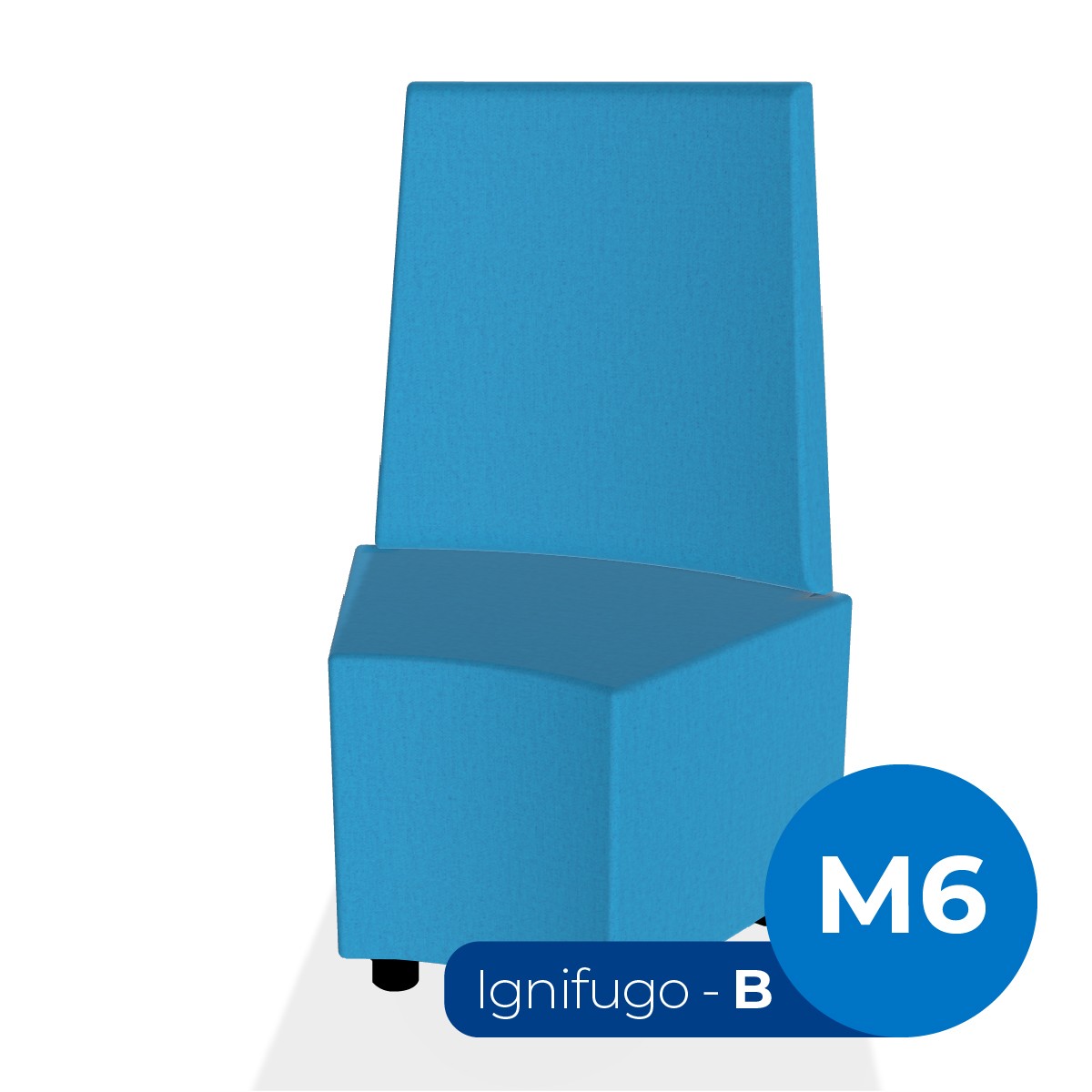 Pouf componibile di forma angolare altezza M6 e schienale alto. Dimensioni: profondità 48cm, raggio esterno 95 cm, altezza da terra 109,5cm, altezza seduta 45,5cm, piedini alla base da 6cm. Compatibile per sistema di aggancio unione elementi. Materiale: rivestimento sfoderabile, tessuto ignifugo colore di tipo "B" ciano, struttura in legno, imbottitura in gomma. La caratteristica chiave di questa linea è la modularità assoluta. E’ possibile infatti creare illimitate combinazioni abbinando le diverse forme dei moduli Flora, al fine di dividere gli ambienti e arricchire gli spazi comuni. Prodotto pensato per gli spazi comuni quali atrii, corridoi ed altre aree di passaggio.