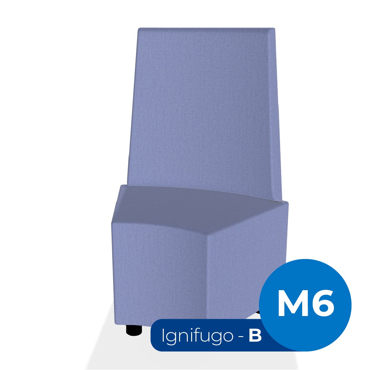 Pouf componibile di forma angolare altezza M6 e schienale alto. Dimensioni: profondità 48cm, raggio esterno 95 cm, altezza da terra 109,5cm, altezza seduta 45,5cm, piedini alla base da 6cm. Compatibile per sistema di aggancio unione elementi. Materiale: rivestimento sfoderabile, tessuto ignifugo colore di tipo "B" lilla, struttura in legno, imbottitura in gomma. La caratteristica chiave di questa linea è la modularità assoluta. E’ possibile infatti creare illimitate combinazioni abbinando le diverse forme dei moduli Flora, al fine di dividere gli ambienti e arricchire gli spazi comuni. Prodotto pensato per gli spazi comuni quali atrii, corridoi ed altre aree di passaggio.