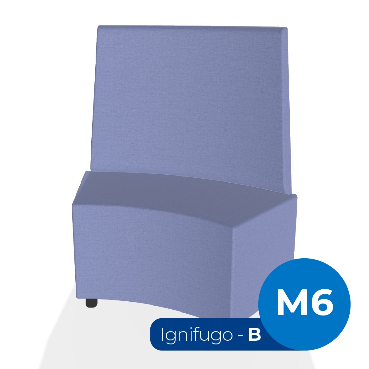Pouf componibile di forma angolare altezza M6 e schienale alto. Dimensioni: profondità 48cm, raggio esterno 140cm,altezza da terra 109,5cm, altezza seduta 45,5cm, piedini alla base da 6 cm. Compatibile per sistema di aggancio unione elementi. Materiale: rivestimento sfoderabile, tessuto ignifugo colore di tipo "B" lilla, struttura in legno, imbottitura in gomma. La caratteristica chiave di questa linea è la modularità assoluta. E’ possibile infatti creare illimitate combinazioni abbinando le diverse forme, al fine di dividere gli ambienti e arricchire gli spazi comuni. Prodotto pensato per gli spazi comuni quali atrii, corridoi ed altre aree di passaggio.