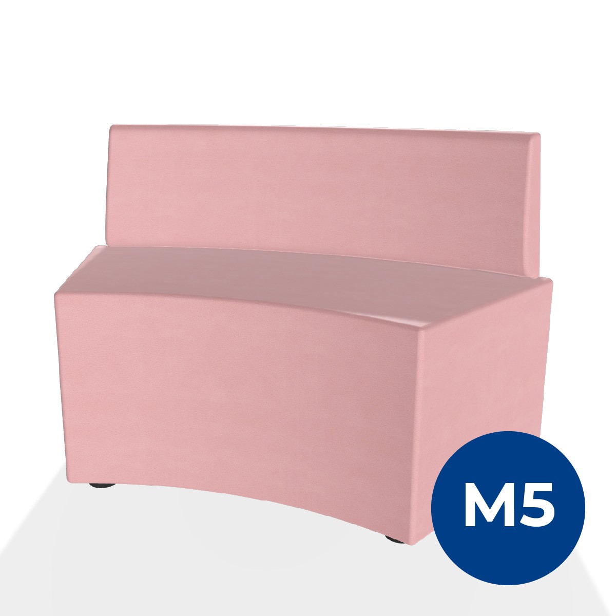 Pouf componibile di forma angolare altezza M5 e schienale basso. Dimensioni: profondità 48cm, raggio esterno 140cm, altezza da terra 70,5cm, altezza seduta 42cm, piedini alla base da 2,5 cm. Compatibile per sistema di aggancio unione elementi. Materiale: rivestimento sfoderabile, similpelle ignifuga classe 1 colore rosa, struttura in legno, imbottitura in gomma. La caratteristica chiave di questa linea è la modularità assoluta. E’ possibile infatti creare illimitate combinazioni abbinando le diverse forme, al fine di dividere gli ambienti e arricchire gli spazi comuni. Prodotto pensato per gli spazi comuni quali atrii, corridoi ed altre aree di passaggio.