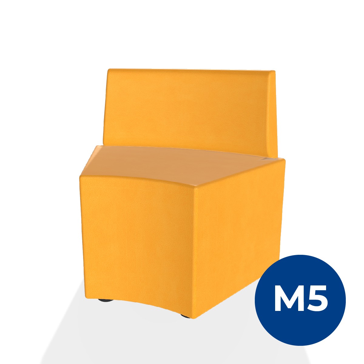 Pouf componibile di forma angolare altezza M5 e schienale basso. Dimensioni: profondità 48cm, raggio esterno 95cm,altezza da terra 70,5 cm, altezza seduta 42cm, piedini alla base da 2,5 cm. Compatibile per sistema di aggancio unione elementi. Materiale: rivestimento sfoderabile, similpelle ignifuga classe 1 colore arancione, struttura in legno, imbottitura in gomma. La caratteristica chiave di questa linea è la modularità assoluta. E’ possibile infatti creare illimitate combinazioni abbinando le diverse forme, al fine di dividere gli ambienti e arricchire gli spazi comuni. Prodotto pensato per gli spazi comuni quali atrii, corridoi ed altre aree di passaggio.