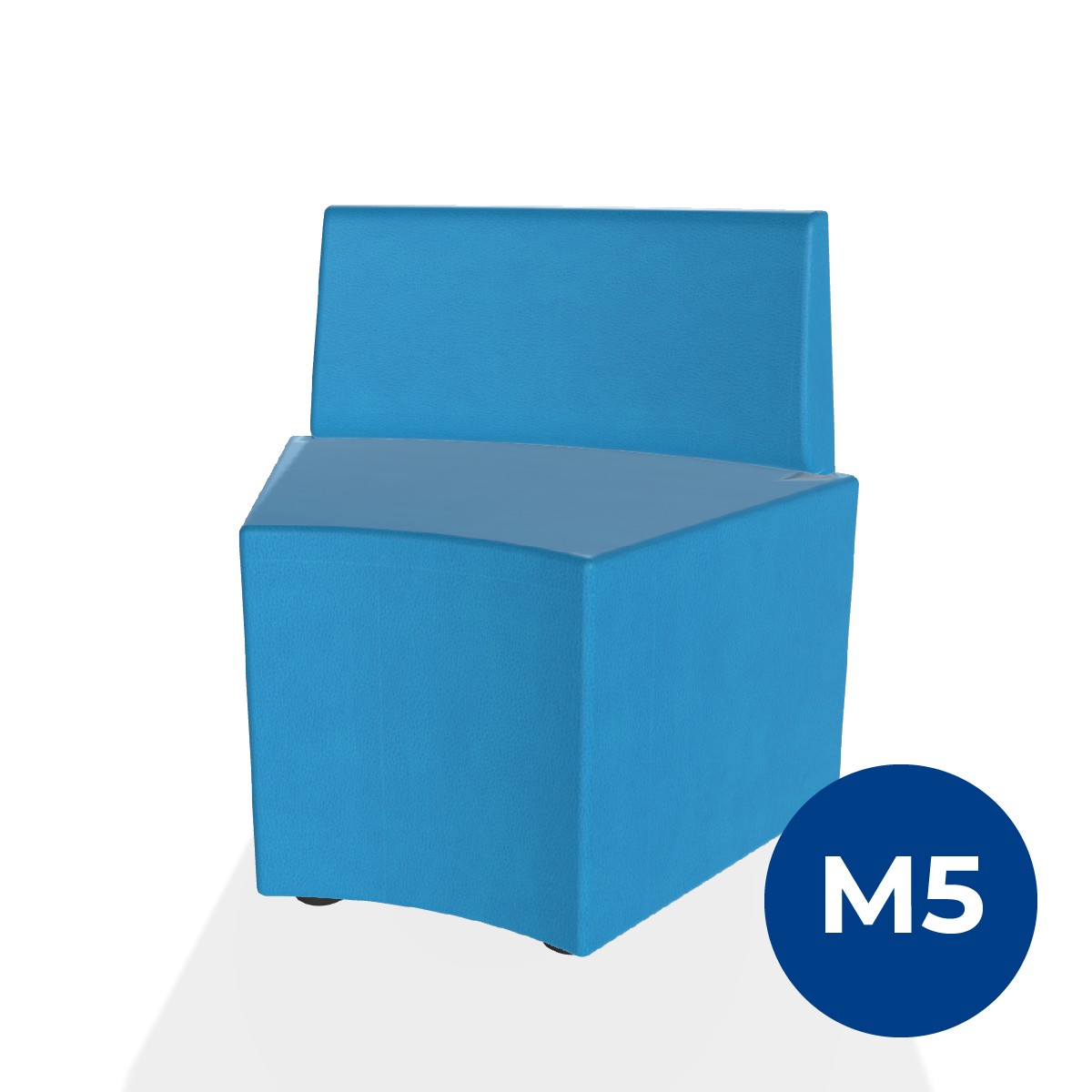 Pouf componibile di forma angolare altezza M5 e schienale basso. Dimensioni: profondità 48cm, raggio esterno 95cm,altezza da terra 70,5 cm, altezza seduta 42cm, piedini alla base da 2,5 cm. Compatibile per sistema di aggancio unione elementi. Materiale: rivestimento sfoderabile, similpelle ignifuga classe 1 colore azzurro, struttura in legno, imbottitura in gomma. La caratteristica chiave di questa linea è la modularità assoluta. E’ possibile infatti creare illimitate combinazioni abbinando le diverse forme, al fine di dividere gli ambienti e arricchire gli spazi comuni. Prodotto pensato per gli spazi comuni quali atrii, corridoi ed altre aree di passaggio.