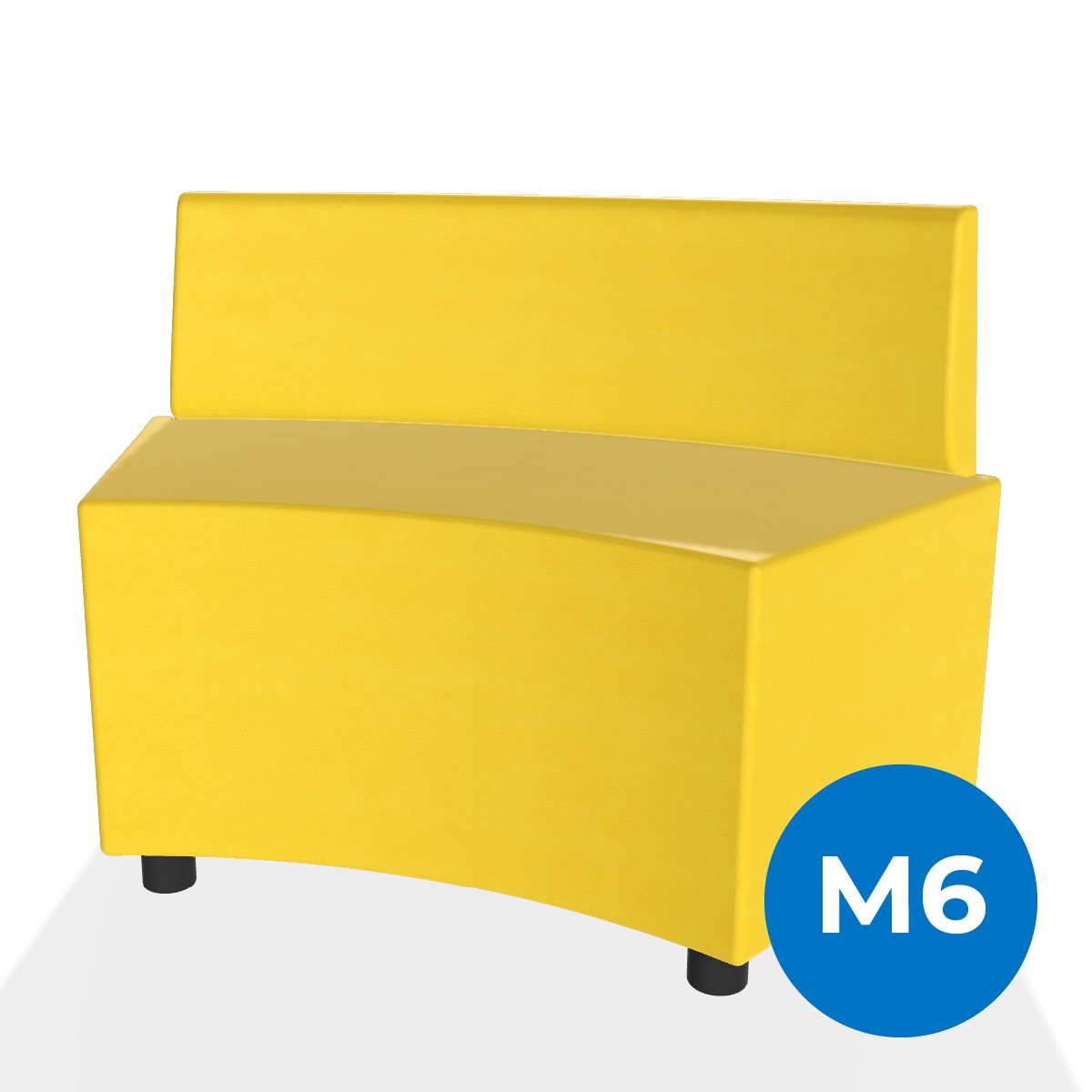 Pouf componibile di forma angolare altezza M6 e schienale basso. Dimensioni: profondità 48cm, raggio esterno 140cm, altezza da terra 74cm, altezza seduta 45,5cm, piedini alla base da 6 cm. Compatibile per sistema di aggancio unione elementi. Materiale: rivestimento sfoderabile, similpelle ignifuga classe 1 colore giallo, struttura in legno, imbottitura in gomma. La caratteristica chiave di questa linea è la modularità assoluta. E’ possibile infatti creare illimitate combinazioni abbinando le diverse forme, al fine di dividere gli ambienti e arricchire gli spazi comuni. Prodotto pensato per gli spazi comuni quali atrii, corridoi ed altre aree di passaggio.