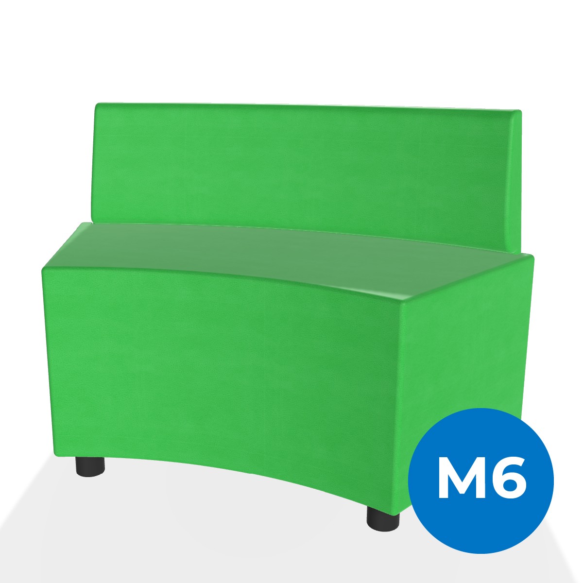 Pouf componibile di forma angolare altezza M6 e schienale basso. Dimensioni: profondità 48cm, raggio esterno 140cm, altezza da terra 74cm, altezza seduta 45,5cm, piedini alla base da 6 cm. Compatibile per sistema di aggancio unione elementi. Materiale: rivestimento sfoderabile, similpelle ignifuga classe 1 colore verde, struttura in legno, imbottitura in gomma. La caratteristica chiave di questa linea è la modularità assoluta. E’ possibile infatti creare illimitate combinazioni abbinando le diverse forme, al fine di dividere gli ambienti e arricchire gli spazi comuni. Prodotto pensato per gli spazi comuni quali atrii, corridoi ed altre aree di passaggio.
