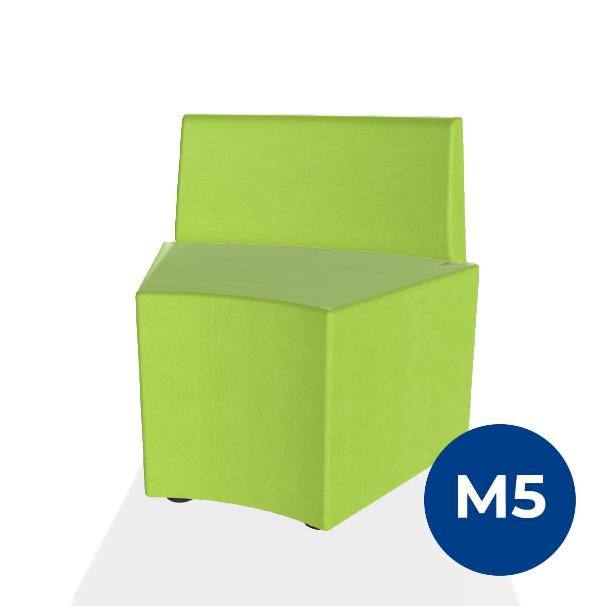Pouf componibile di forma angolare altezza M5 e schienale basso. Dimensioni: profondità 48cm, raggio esterno 95cm,altezza da terra 70,5 cm, altezza seduta 42cm, piedini alla base da 2,5 cm. Compatibile per sistema di aggancio unione elementi. Materiale: rivestimento sfoderabile, similpelle ignifuga classe 1 colore verde chiaro, struttura in legno, imbottitura in gomma. La caratteristica chiave di questa linea è la modularità assoluta. E’ possibile infatti creare illimitate combinazioni abbinando le diverse forme, al fine di dividere gli ambienti e arricchire gli spazi comuni. Prodotto pensato per gli spazi comuni quali atrii, corridoi ed altre aree di passaggio.