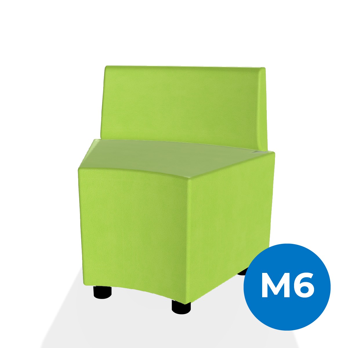 Pouf componibile di forma angolare altezza M6 e schienale basso. Dimensioni: profondità 48cm, raggio esterno 95 cm, altezza da terra 74 cm, altezza seduta 45,5cm, piedini alla base da 6cm. Compatibile per sistema di aggancio unione elementi. Materiale: rivestimento sfoderabile, similpelle ignifuga classe 1 colore verde chiaro, struttura in legno, imbottitura in gomma. La caratteristica chiave di questa linea è la modularità assoluta. E’ possibile infatti creare illimitate combinazioni abbinando le diverseforme, al fine di dividere gli ambienti e arricchire gli spazi comuni. Prodotto pensato per gli spazi comuni quali atrii, corridoi ed altre aree di passaggio.