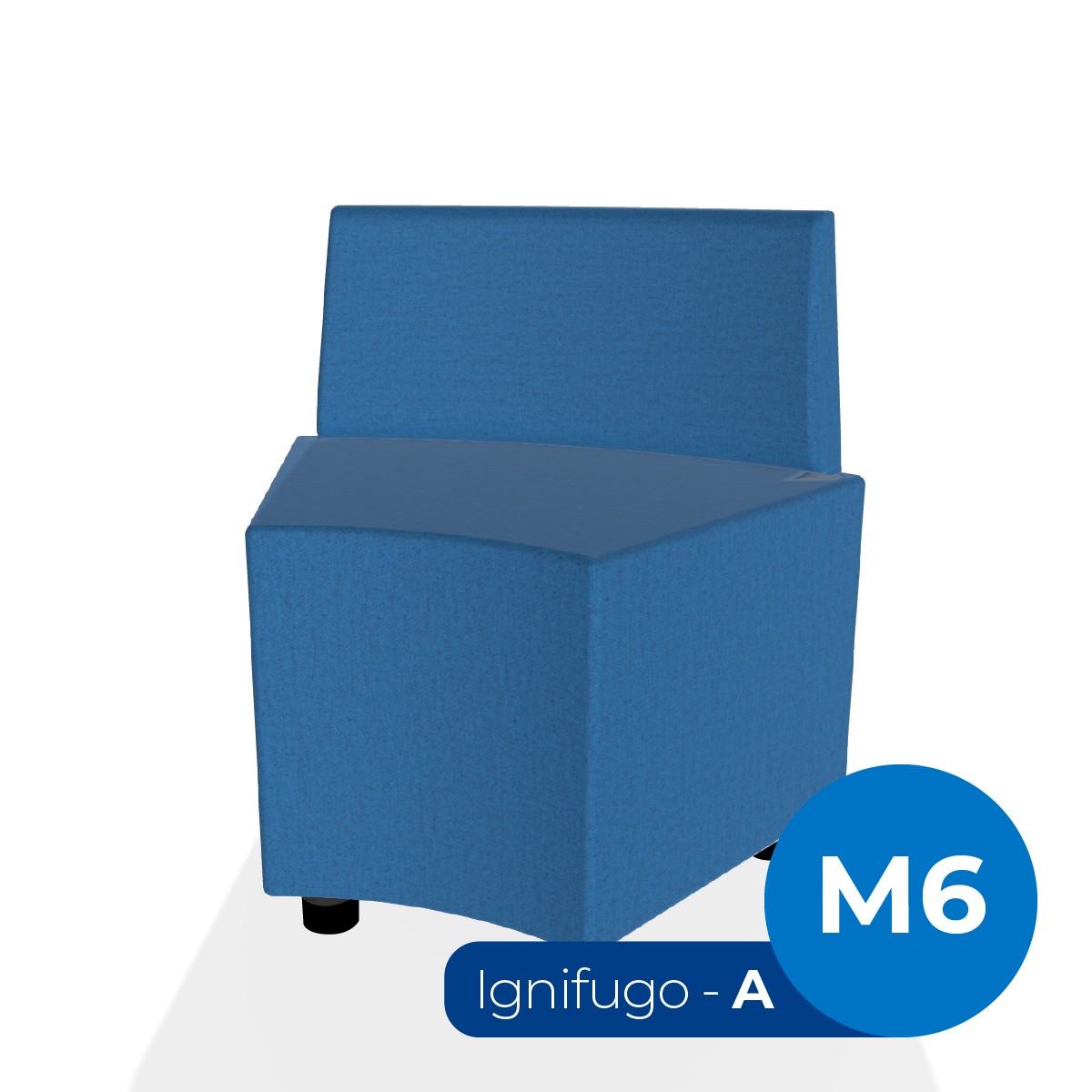 Pouf componibile di forma angolare altezza M6 e schienale basso. Dimensioni: profondità 48cm, raggio esterno 95 cm, altezza da terra 74cm, altezza seduta 45,5cm, piedini alla base da 6cm. Compatibile per sistema di aggancio unione elementi. Materiale: rivestimento sfoderabile, tessuto ignifugo colore di tipo "A" blu chiaro, struttura in legno, imbottitura in gomma. La caratteristica chiave di questa linea è la modularità assoluta. E’ possibile infatti creare illimitate combinazioni abbinando le diverseforme, al fine di dividere gli ambienti e arricchire gli spazi comuni. Prodotto pensato per gli spazi comuni quali atrii, corridoi ed altre aree di passaggio.