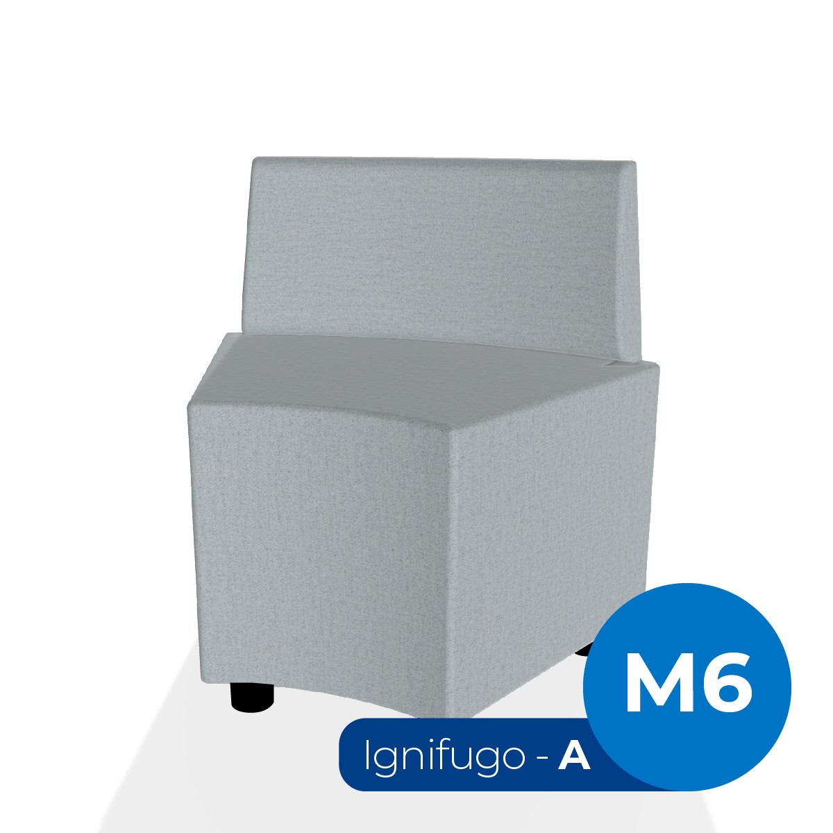 Pouf componibile di forma angolare altezza M6 e schienale basso. Dimensioni: profondità 48cm, raggio esterno 95 cm, altezza da terra 74cm, altezza seduta 45,5cm, piedini alla base da 6cm. Compatibile per sistema di aggancio unione elementi. Materiale: rivestimento sfoderabile, tessuto ignifugo colore di tipo "A" grigio, struttura in legno, imbottitura in gomma. La caratteristica chiave di questa linea è la modularità assoluta. E’ possibile infatti creare illimitate combinazioni abbinando le diverseforme, al fine di dividere gli ambienti e arricchire gli spazi comuni. Prodotto pensato per gli spazi comuni quali atrii, corridoi ed altre aree di passaggio.