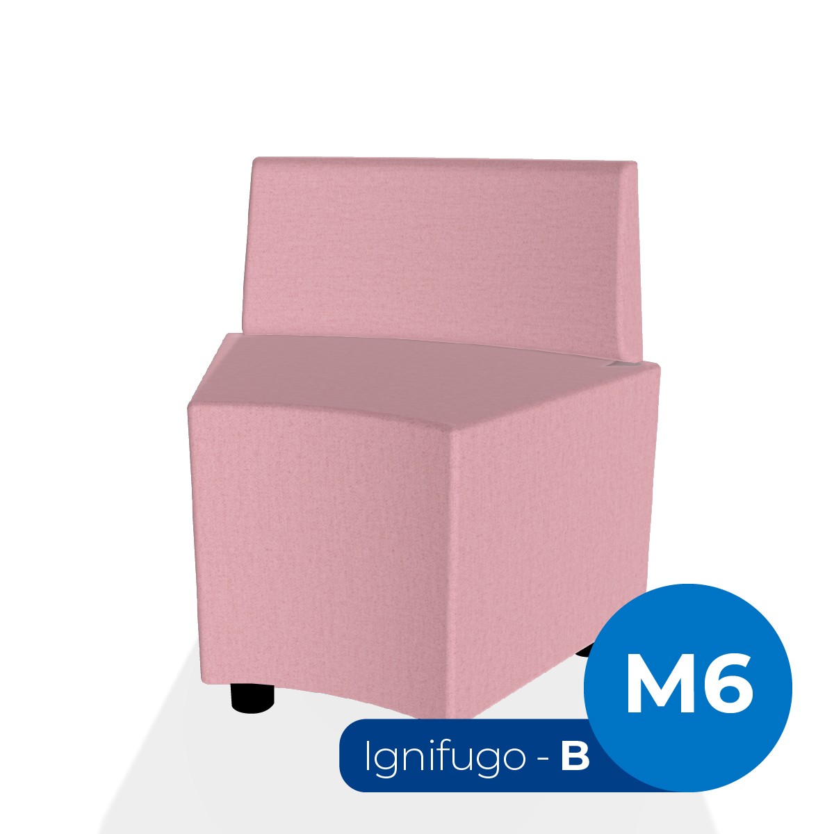 Pouf componibile di forma angolare altezza M6 e schienale basso. Dimensioni: profondità 48cm, raggio esterno 95 cm, altezza da terra 74cm, altezza seduta 45,5cm, piedini alla base da 6cm. Compatibile per sistema di aggancio unione elementi. Materiale: rivestimento sfoderabile, tessuto ignifugo colore di tipo "B" rosa, struttura in legno, imbottitura in gomma. La caratteristica chiave di questa linea è la modularità assoluta. E’ possibile infatti creare illimitate combinazioni abbinando le diverse forme, al fine di dividere gli ambienti e arricchire gli spazi comuni. Prodotto pensato per gli spazi comuni quali atrii, corridoi ed altre aree di passaggio.