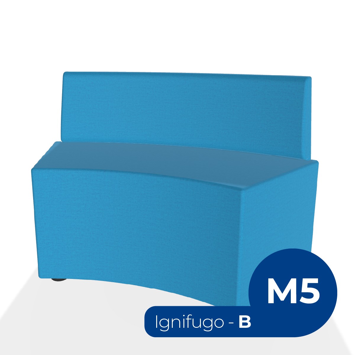 Pouf componibile di forma angolare altezza M5 e schienale basso. Dimensioni: profondità 48cm, raggio esterno 140cm, altezza da terra 70,5cm, altezza seduta 42cm, piedini alla base da 2,5 cm. Compatibile per sistema di aggancio unione elementi. Materiale: rivestimento sfoderabile, tessuto ignifugo colore di tipo "B" ciano, struttura in legno, imbottitura in gomma. La caratteristica chiave di questa linea è la modularità assoluta. E’ possibile infatti creare illimitate combinazioni abbinando le diverse forme, al fine di dividere gli ambienti e arricchire gli spazi comuni. Prodotto pensato per gli spazi comuni quali atrii, corridoi ed altre aree di passaggio.