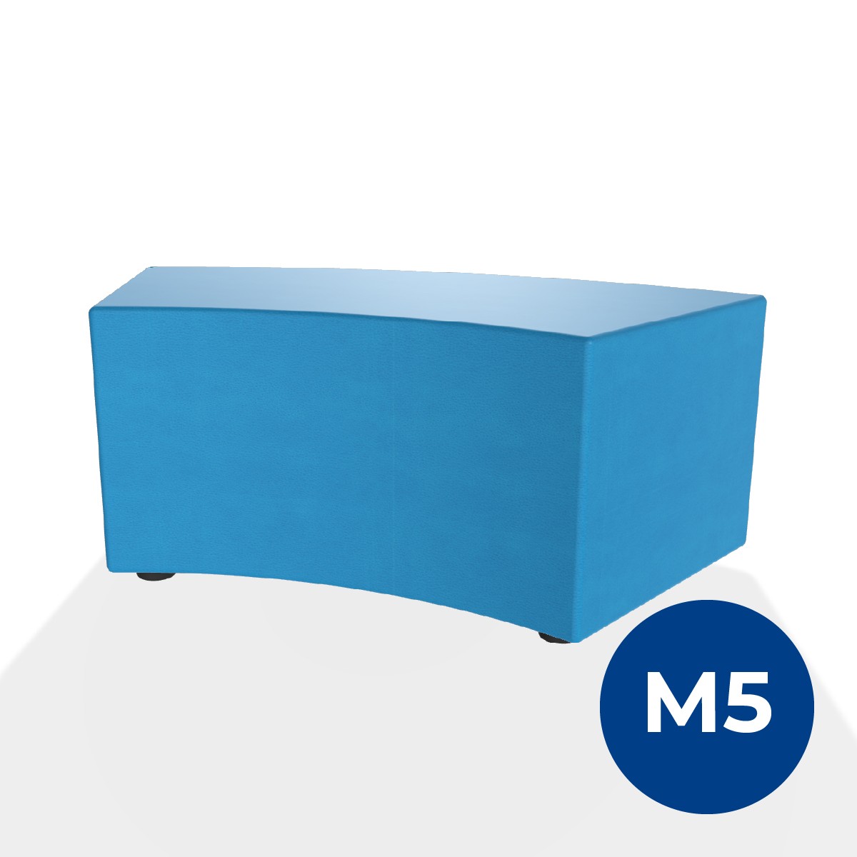 Pouf componibile di forma angolare altezza M5. Dimensioni: profondità 48cm, raggio esterno 140cm, altezza 42cm, piedini alla base da 2,5 cm. Compatibile per sistema di aggancio unione elementi. Materiale: rivestimento sfoderabile, similpelle ignifuga classe 1 colore azzurro, struttura in legno, imbottitura in gomma. La caratteristica chiave di questa linea è la modularità assoluta. E’ possibile infatti creare illimitate combinazioni abbinando le diverse forme, al fine di dividere gli ambienti e arricchire gli spazi comuni. Prodotto pensato per gli spazi comuni quali atrii, corridoi ed altre aree di passaggio.