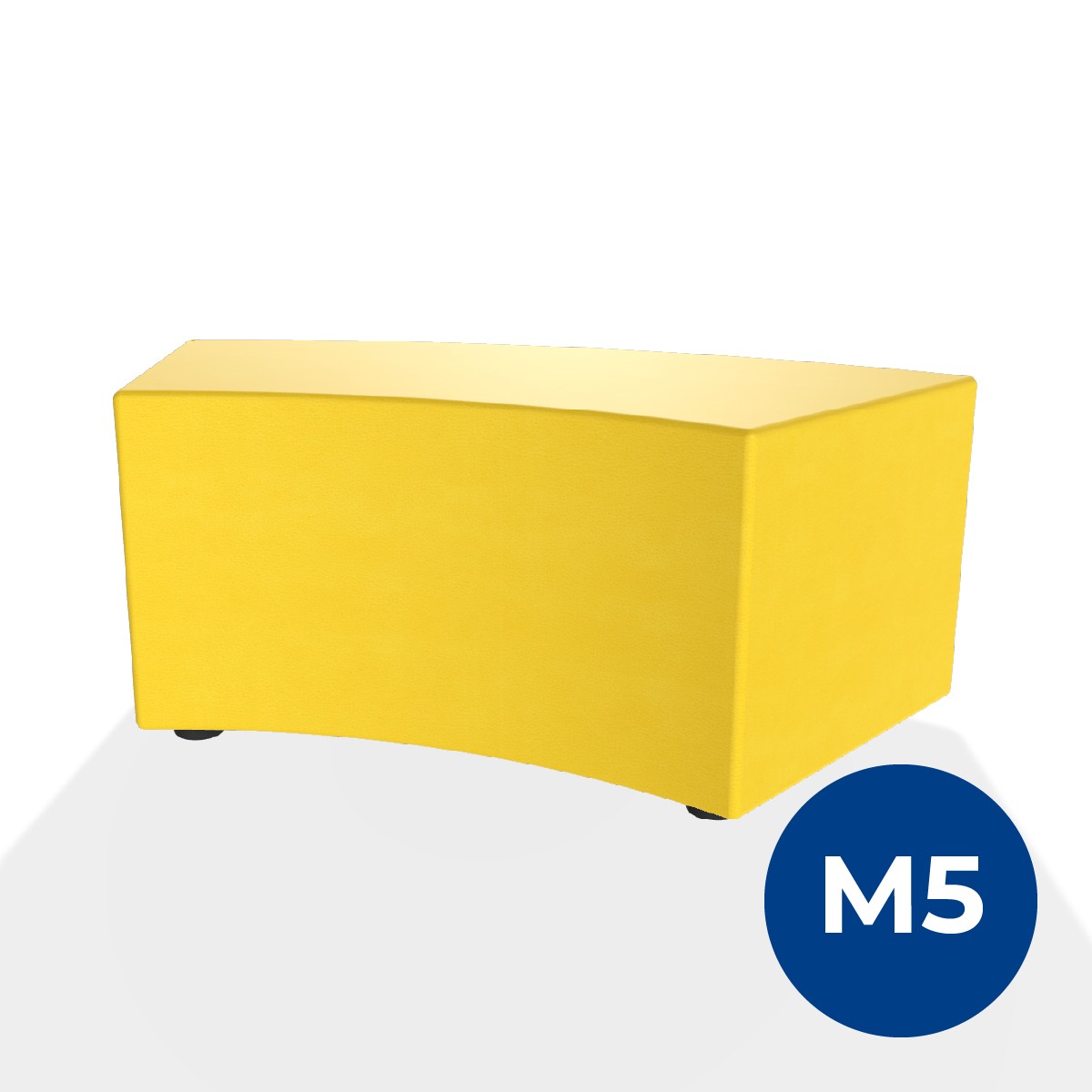 Pouf componibile di forma angolare altezza M5. Dimensioni: profondità 48cm, raggio esterno 140cm, altezza 42cm, piedini alla base da 2,5 cm. Compatibile per sistema di aggancio unione elementi. Materiale: rivestimento sfoderabile, similpelle ignifuga classe 1 colore giallo, struttura in legno, imbottitura in gomma. La caratteristica chiave di questa linea è la modularità assoluta. E’ possibile infatti creare illimitate combinazioni abbinando le diverse forme, al fine di dividere gli ambienti e arricchire gli spazi comuni. Prodotto pensato per gli spazi comuni quali atrii, corridoi ed altre aree di passaggio.
