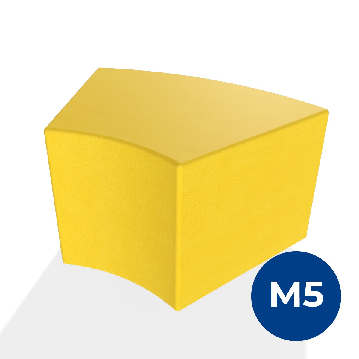 Pouf componibile di forma angolare altezza M5. Dimensioni: profondità 48cm, raggio esterno 95cm, altezza 42cm, piedini alla base da 2,5 cm. Compatibile per sistema di aggancio unione elementi. Materiale: rivestimento sfoderabile, similpelle ignifuga classe 1 colore giallo, struttura in legno, imbottitura in gomma. La caratteristica chiave di questa linea è la modularità assoluta. E’ possibile infatti creare illimitate combinazioni abbinando le diverse forme, al fine di dividere gli ambienti e arricchire gli spazi comuni. Prodotto pensato per gli spazi comuni quali atrii, corridoi ed altre aree di passaggio.