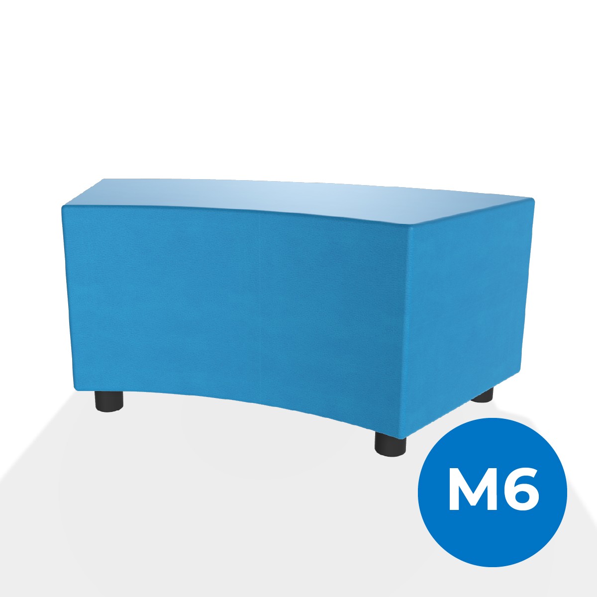 Pouf componibile di forma angolare altezza M6. Dimensioni: profondità 48cm, raggio esterno 140cm, altezza 45,5cm, piedini alla base da 6 cm. Compatibile per sistema di aggancio unione elementi. Materiale: rivestimento sfoderabile, similpelle ignifuga classe 1 colore azzurro, struttura in legno, imbottitura in gomma. La caratteristica chiave di questa linea è la modularità assoluta. E’ possibile infatti creare illimitate combinazioni abbinando le diverse forme, al fine di dividere gli ambienti e arricchire gli spazi comuni. Prodotto pensato per gli spazi comuni quali atrii, corridoi ed altre aree di passaggio.