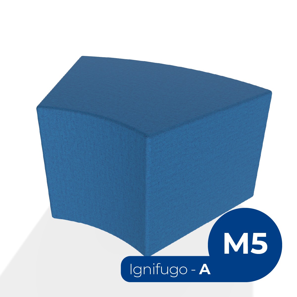 Pouf componibile di forma angolare altezza M5. Dimensioni: profondità 48cm, raggio esterno 95cm, altezza 42cm, piedini alla base da 2,5 cm. Compatibile per sistema di aggancio unione elementi. Materiale: rivestimento sfoderabile, tessuto ignifugo colore di tipo "A" blu chiaro, struttura in legno, imbottitura in gomma. La caratteristica chiave di questa linea è la modularità assoluta. E’ possibile infatti creare illimitate combinazioni abbinando le diverse forme, al fine di dividere gli ambienti e arricchire gli spazi comuni. Prodotto pensato per gli spazi comuni quali atrii, corridoi ed altre aree di passaggio.