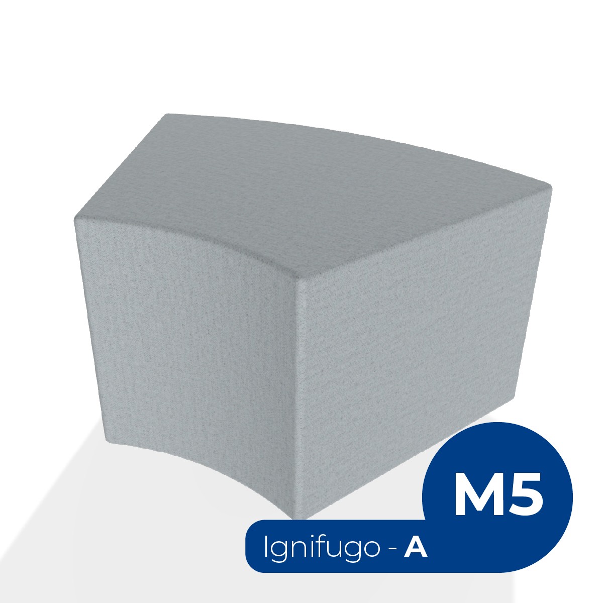 Pouf componibile di forma angolare altezza M5. Dimensioni: profondità 48cm, raggio esterno 95cm, altezza 42cm, piedini alla base da 2,5 cm. Compatibile per sistema di aggancio unione elementi. Materiale: rivestimento sfoderabile, tessuto ignifugo colore di tipo "A" grigio, struttura in legno, imbottitura in gomma. La caratteristica chiave di questa linea è la modularità assoluta. E’ possibile infatti creare illimitate combinazioni abbinando le diverse forme, al fine di dividere gli ambienti e arricchire gli spazi comuni. Prodotto pensato per gli spazi comuni quali atrii, corridoi ed altre aree di passaggio.