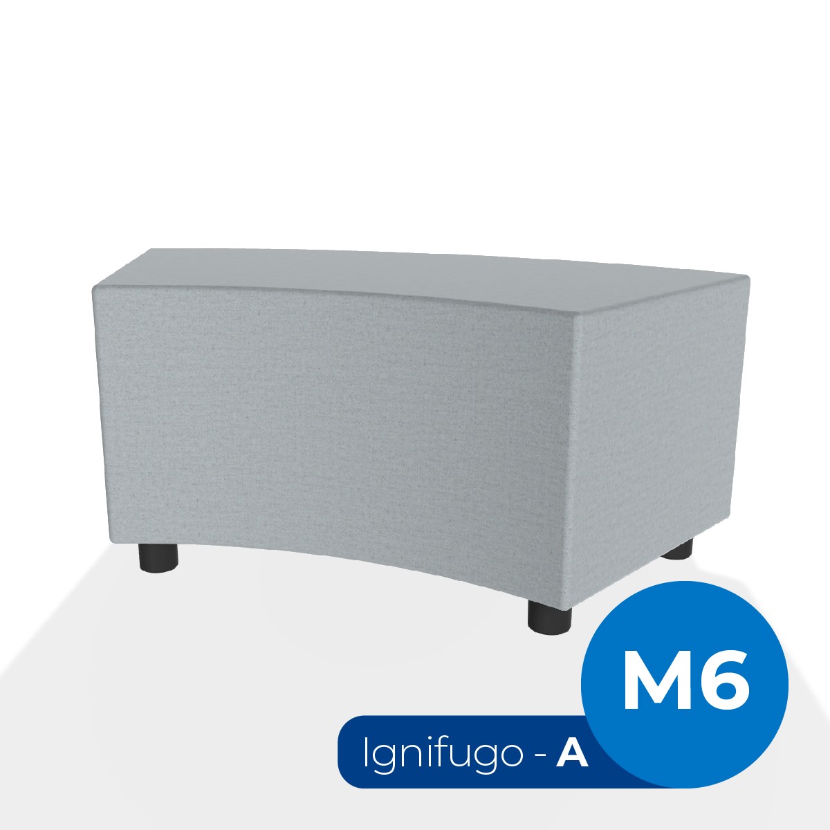 Pouf componibile di forma angolare altezza M6. Dimensioni: profondità 48cm, raggio esterno 140cm, altezza 45,5cm, piedini alla base da 6 cm. Compatibile per sistema di aggancio unione elementi. Materiale: rivestimento sfoderabile, tessuto ignifugo colore di tipo "A" grigio, struttura in legno, imbottitura in gomma. La caratteristica chiave di questa linea è la modularità assoluta. E’ possibile infatti creare illimitate combinazioni abbinando le diverse forme, al fine di dividere gli ambienti e arricchire gli spazi comuni. Prodotto pensato per gli spazi comuni quali atrii, corridoi ed altre aree di passaggio.
