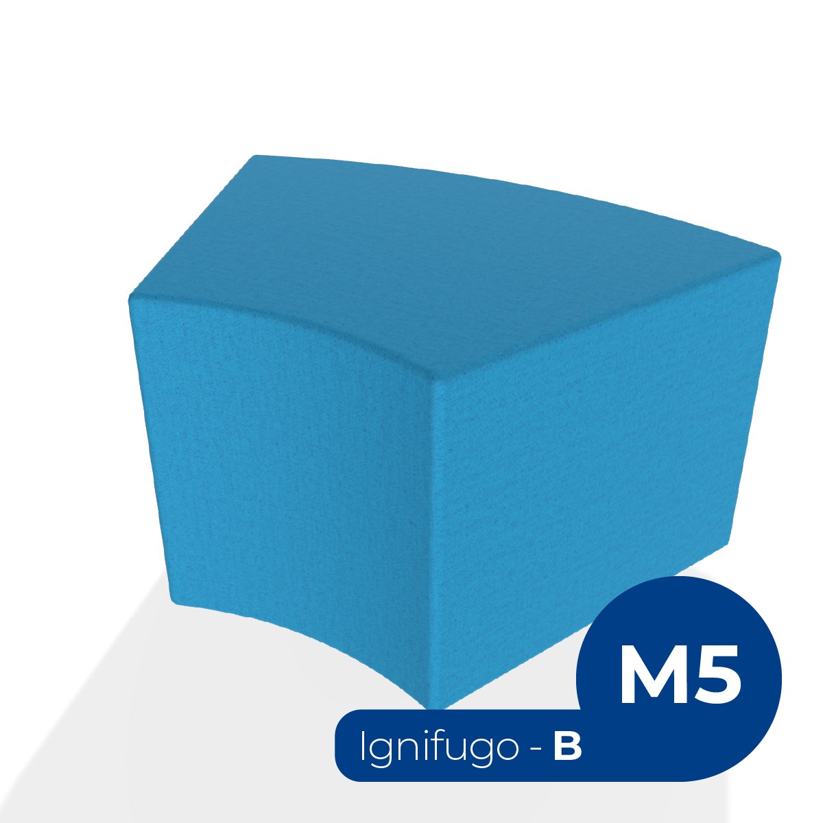 Pouf componibile di forma angolare altezza M5. Dimensioni: profondità 48cm, raggio esterno 95cm, altezza 42cm, piedini alla base da 2,5 cm. Compatibile per sistema di aggancio unione elementi. Materiale: rivestimento sfoderabile, tessuto ignifugo colore di tipo "B" ciano, struttura in legno, imbottitura in gomma. La caratteristica chiave di questa linea è la modularità assoluta. E’ possibile infatti creare illimitate combinazioni abbinando le diverse forme, al fine di dividere gli ambienti e arricchire gli spazi comuni. Prodotto pensato per gli spazi comuni quali atrii, corridoi ed altre aree di passaggio.