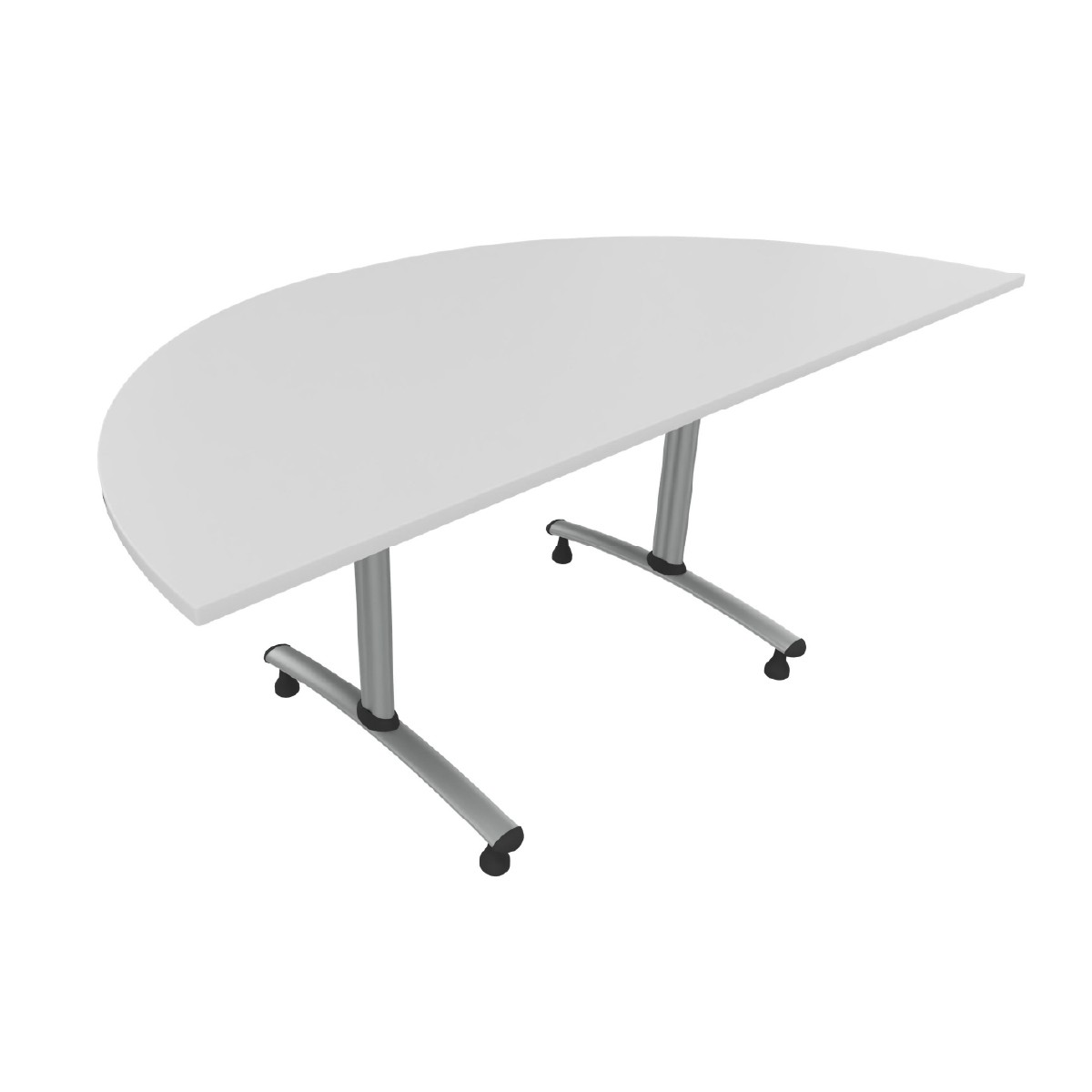 Tavolo di forma semicircolare con piano fisso e gambe altezza M6 con piedini. Dimensioni mezzocerchio Raggio 90cm Materiale: piano in truciolare FSC Mix spessore 22mm rivestito in melamina bianca con bordo spessore 2mm, gambe in metallo verniciato colore grigio. Il prodotto è aggregabile: il piano è predisposto per il montaggio di 4 ganci sugli spigoli al fine di unire i tavoli tra loro. Prodotto consegnato da montare, dotato di documentazione e conforme ai Criteri Ambientali Minimi DM 23 Giugno 2022 n.254