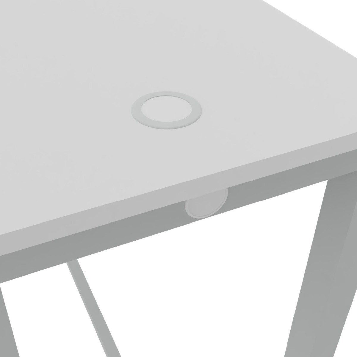 Tavolo spessore 2,2cm dimensioni 160x80cm altezza da terra 107,2cm di colore bianco e con bordo 2mm bianco stessa tinta. Sul piano sono presenti 2 fori per il passaggio cavi, uno da 60 e da 80mm, completi di tappo passacavi sempre di colore bianco. Struttura in tubolare quadro 5cm e poggiapiedi da 4cm, colore grigio chiaro, con 4piedini regolabili alla base. Sulla struttura sono presenti fori passacavo che consentono il passaggio di una presa schuko dalla base di ogni gamba all interno della stessa, quindi fino al sottopiano, in prossimità dei fori da 60 e da 80 mm.