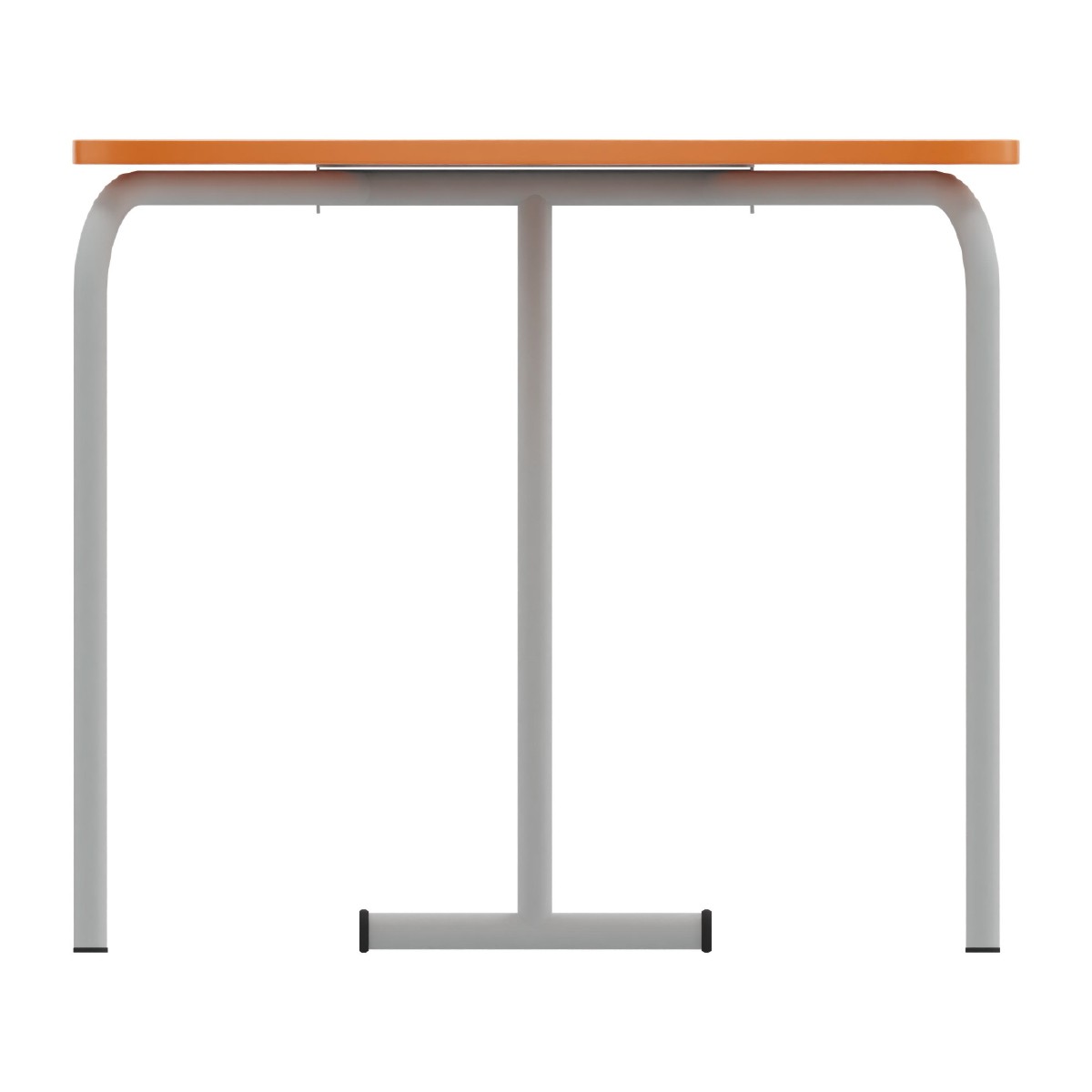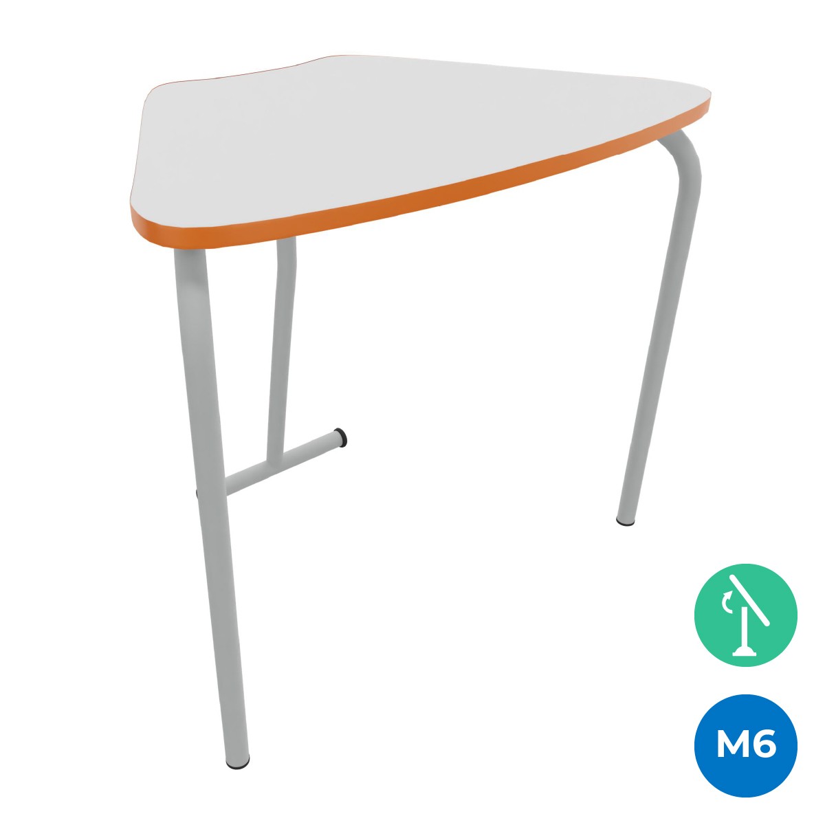Tavolo di forma trapezoidale, spicchio di un cerchio da 6tavoli del diametro di 1,76mt . Dimensioni: 83x55,5cm, altezza da 76cm. Materiale: piano in truciolare FSC Mix spessore 22mm rivestito in melamina bianca con bordo spessore 2mm colore arancione, gambe in metallo verniciato colore grigio. Il prodotto è aggregabile. Certificato secondo la norma EN 1729/1 e EN 1729/2. Prodotto consegnato da montare, le gambe si agganciano al piano mediante 6 viti.