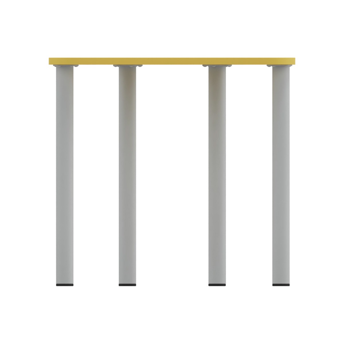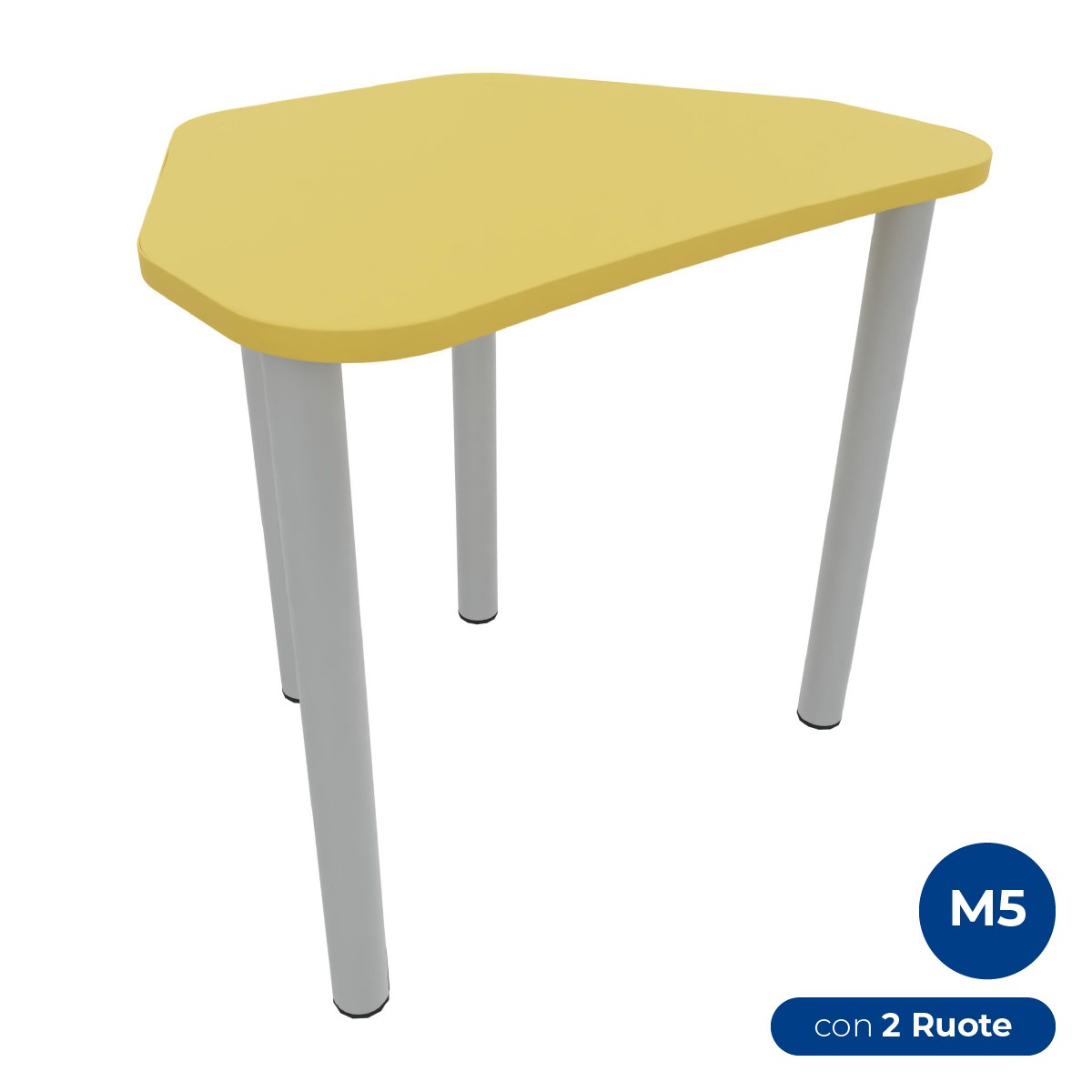 Tavolo di forma trapezoidale con gambe altezza M5 con 2piedini e 2 ruote sferiche push pull. Dimensioni: 75,5x58,5cm, altezza 71cm. Materiale: piano in truciolare FSC Mix spessore 22mm rivestito in melamina giallo con bordo spessore 2mm colore giallo, gambe in metallo verniciato colore grigio. Il prodotto è aggregabile. Il piano è predisposto per il montaggio di 2 ganci, uno sul lato sinistro ed uno sul lato destro al fine di unire i tavoli tra loro, sia affiancati orizzontalmente, sia quando uniti a gruppi da 6. Certificato secondo la norma EN 1729/1 e EN 1729/2. Prodotto consegnato da montare, le gambe si agganciano al piano mediante viti.
