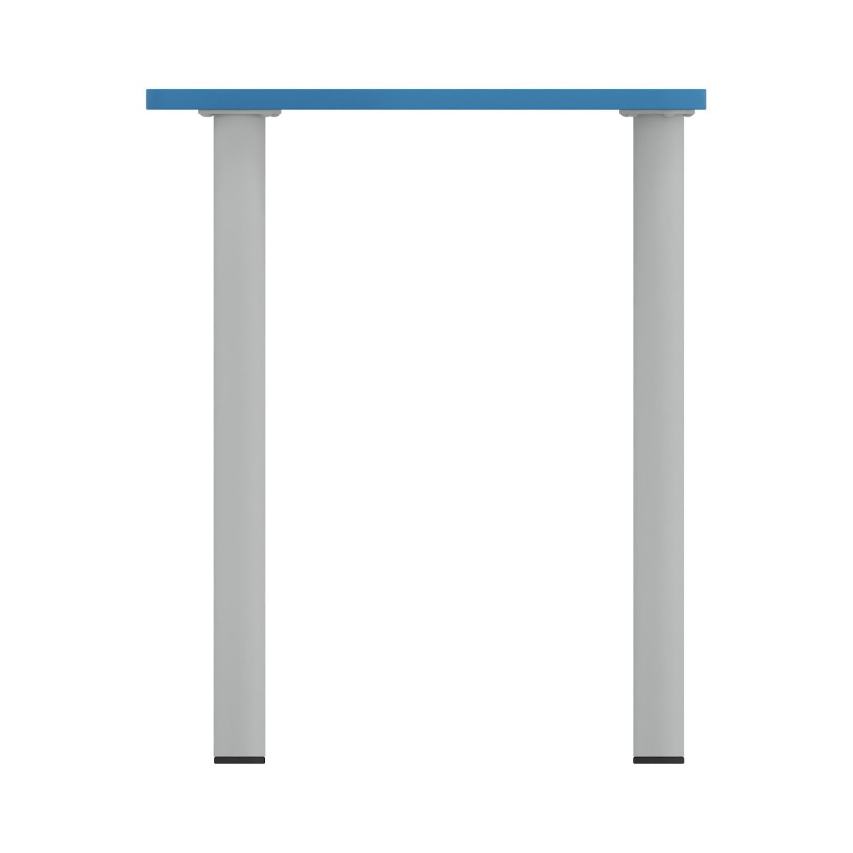 Tavolo di forma trapezoidale con gambe altezza M6 con 2piedini e 2 ruote sferiche push pull. Dimensioni: 75,5x58,5cm, altezza 76cm. Materiale: piano in truciolare FSC Mix spessore 22mm rivestito in melamina bianca con bordo spessore 2mm colore BLU, gambe in metallo verniciato colore grigio. Il prodotto è aggregabile. Il piano è predisposto per il montaggio di 2 ganci, uno sul lato sinistro ed uno sul lato destro al fine di unire i tavoli tra loro, sia affiancati orizzontalmente, sia quando uniti a gruppi da 6. Certificato secondo la norma EN 1729/1 e EN 1729/2. Prodotto consegnato da montare, le gambe si agganciano al piano mediante 6viti.
