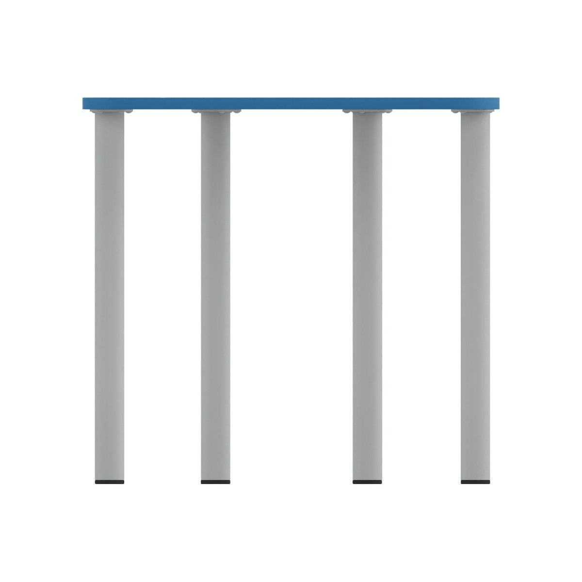 Tavolo di forma trapezoidale con gambe altezza variabile con piedini fissi. Dimensioni: 75,5x58,5cm, altezza 71cm. Materiale: piano in truciolare FSC Mix spessore 22mm rivestito in melamina bianca con bordo spessore 2mm colore blu, gambe in metallo verniciato colore grigio. Il prodotto è aggregabile. Il piano è predisposto per il montaggio di 2 ganci, uno sul lato sinistro ed uno sul lato destro al fine di unire i tavoli tra loro, sia affiancati orizzontalmente, sia quando uniti a gruppi da 6. Certificato secondo la norma EN 1719/1 e EN 1719/2. Prodotto consegnato da montare, le gambe si agganciano al piano mediante 6viti.