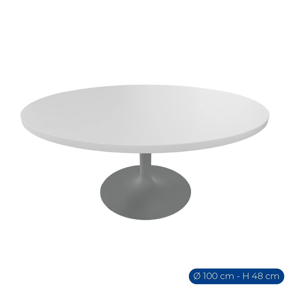 Tavolo di forma circolare completo di struttura. Dimensioni: diametro 100cm, altezza 48,2cm. Materiale: piano in truciolare spessore 22mm rivestito in melamina bianca con bordo spessore 2mm colore bianco, struttura in metallo verniciato colore grigio. Prodotto consegnato da montare.