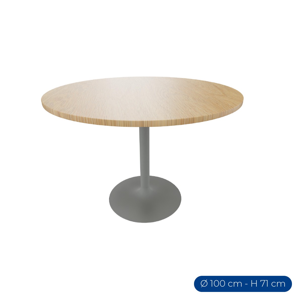 Tavolo di forma circolare completo di struttura. Dimensioni: diametro 100cm, altezza 71,2cm. Materiale: piano in truciolare spessore 22mm rivestito in melamina rovere con bordo spessore 2mm colore rovere, struttura in metallo verniciato colore grigio. Prodotto consegnato da montare.