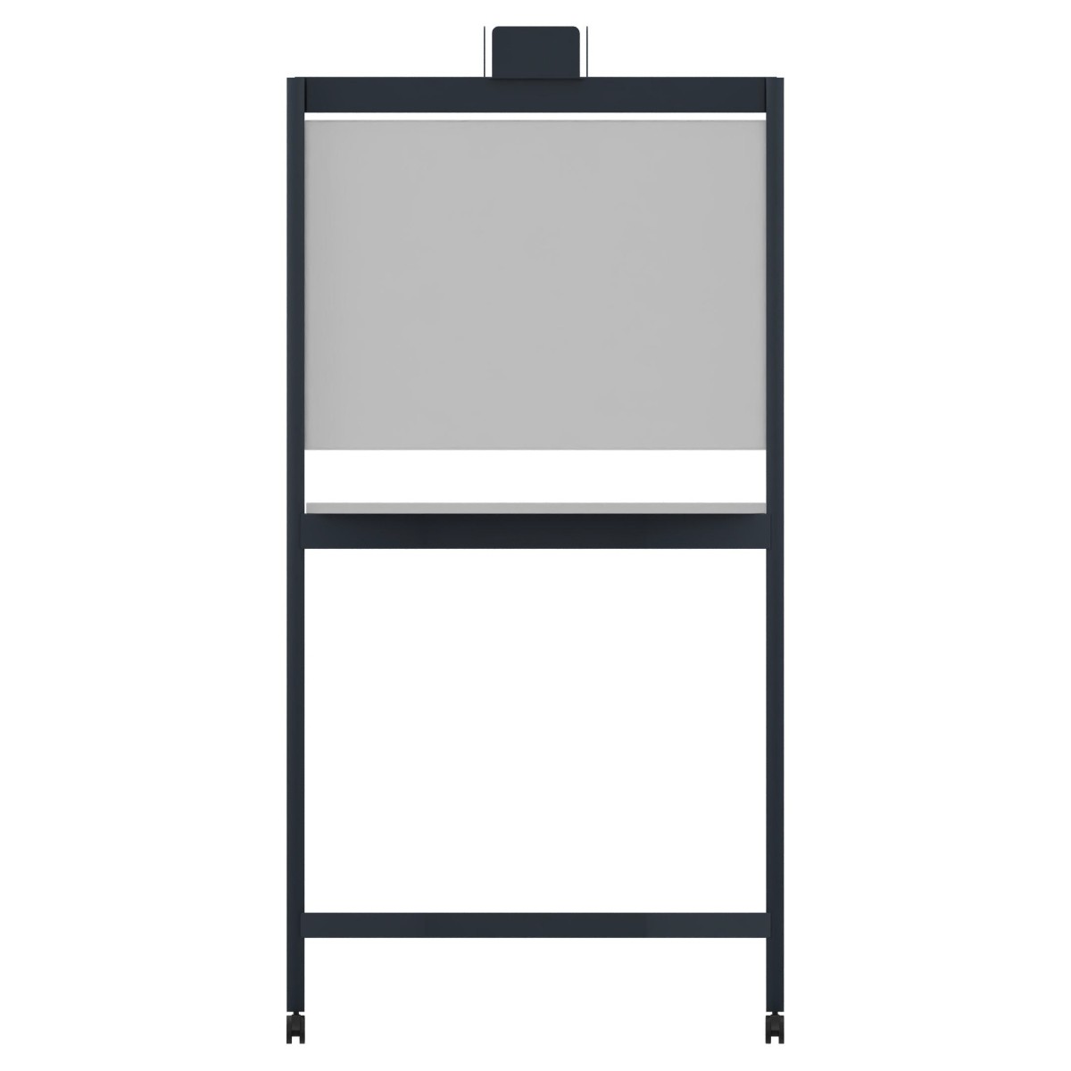 Tavolo bianco con bordo bianco spessore 2mm, grandezza 180x90cm alto 107,2cm al piano, dotato di quattro ruote con freno, struttura sotto al piano e sopra al piano adatta a supportare una lavagna bianca per pennarelli a secco (in dotazione) con la possibilità di poter fissare un porta monitor da massimo 46pollici sui due lati corti del piano. La struttura è di colore blu.