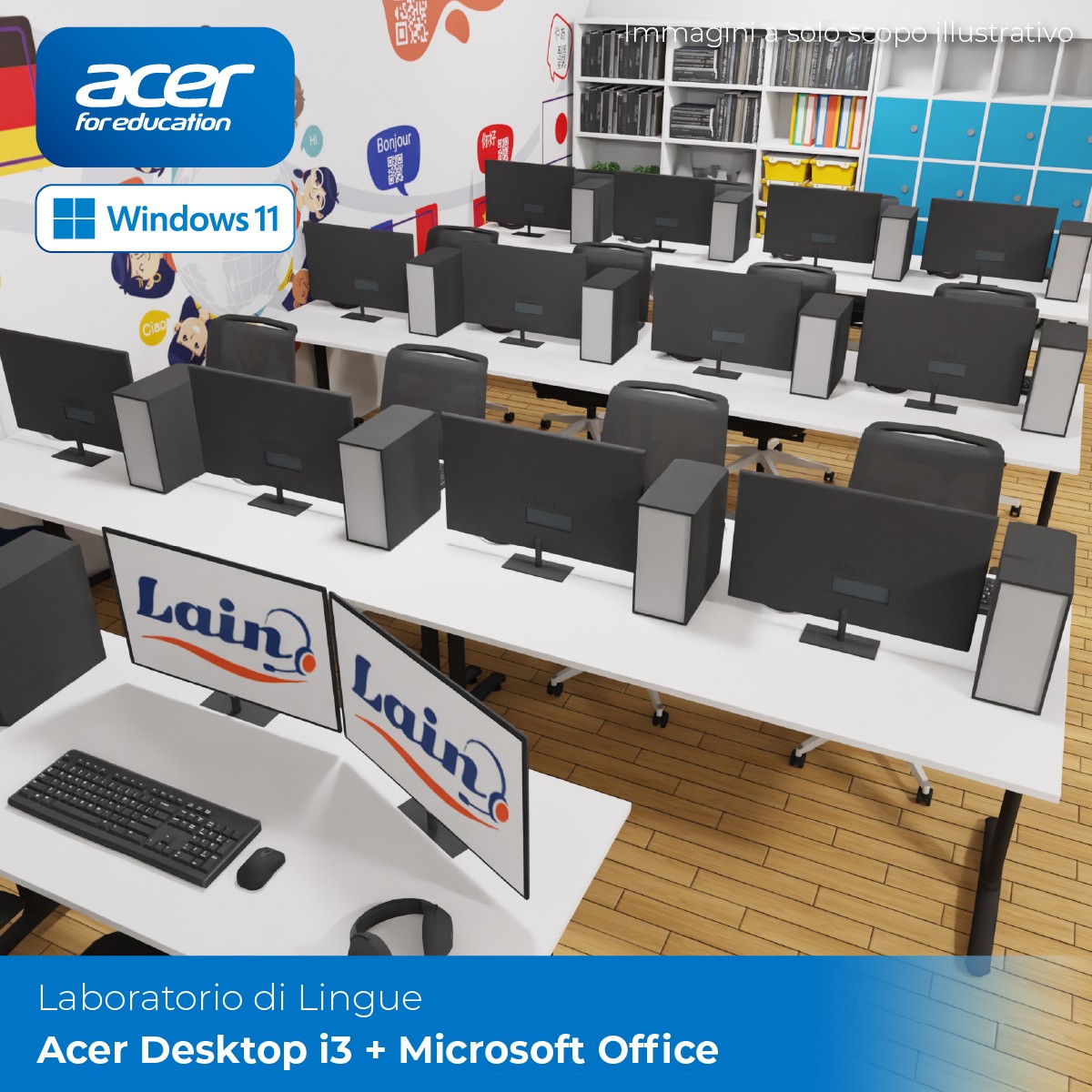 La soluzione proposta è progettata per la realizzazione di un laboratorio linguistico multimediale moderno e funzionale, finalizzato a supportare l’insegnamento e l’apprendimento delle lingue straniere attraverso strumenti digitali avanzati, interattivi e intuitivi. Le 24 postazioni studente si basano su computer desktop Acer Veriton X2710G, dotati di processore Intel Core i3 di 13ª generazione, 8 GB di RAM e unità SSD da 256 GB, che assicurano prestazioni ottimali per l’utilizzo di software didattici, piattaforme multimediali e applicativi di esercitazione linguistica. Il sistema operativo Windows 11 Pro Education garantisce un ambiente sicuro e stabile, ottimizzato per la gestione scolastica e per la didattica interattiva. Ogni postazione è dotata di tastiera, mouse e cuffia professionale con microfono e controllo del volume, indispensabile per le attività di ascolto, registrazione e conversazione in lingua.