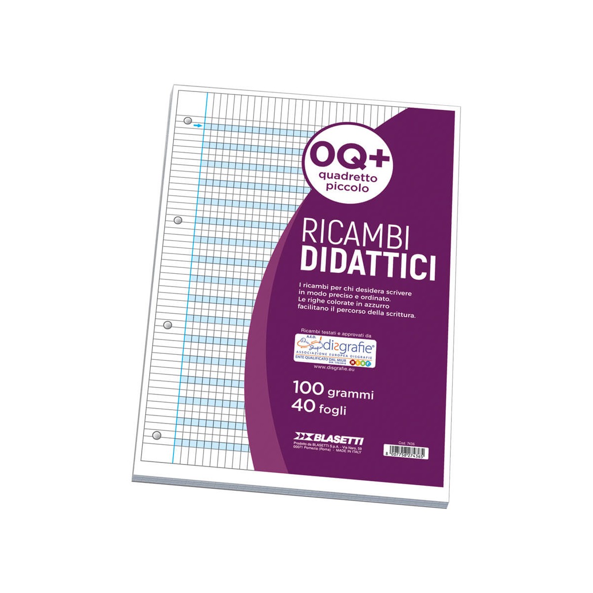 Blasetti 7436. Colorazione: Monocromatico, Colore del prodotto: Blu, Bianco, Formato: A4, Quantità di fogli: 40 fogli, Peso medio: 100 g/m², Tipo di carta prevalente: Carta quadrettata, Tipo di copertina per libro: Senza coperchio