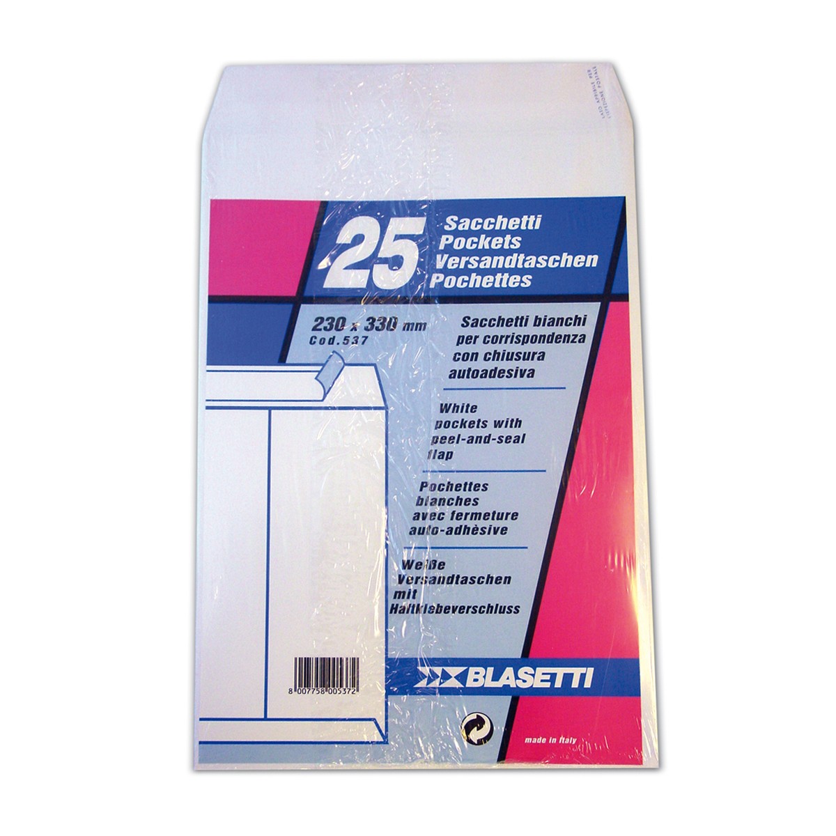 Blasetti Sacco Self 80 23 x 33 cm Pack 25. Colore del prodotto: Bianco, Materiali: Carta, Peso medio: 80 g/m². Larghezza: 230 mm, Lunghezza: 330 mm. Quantità per pacco: 25 pz. Paese di origine: Italia