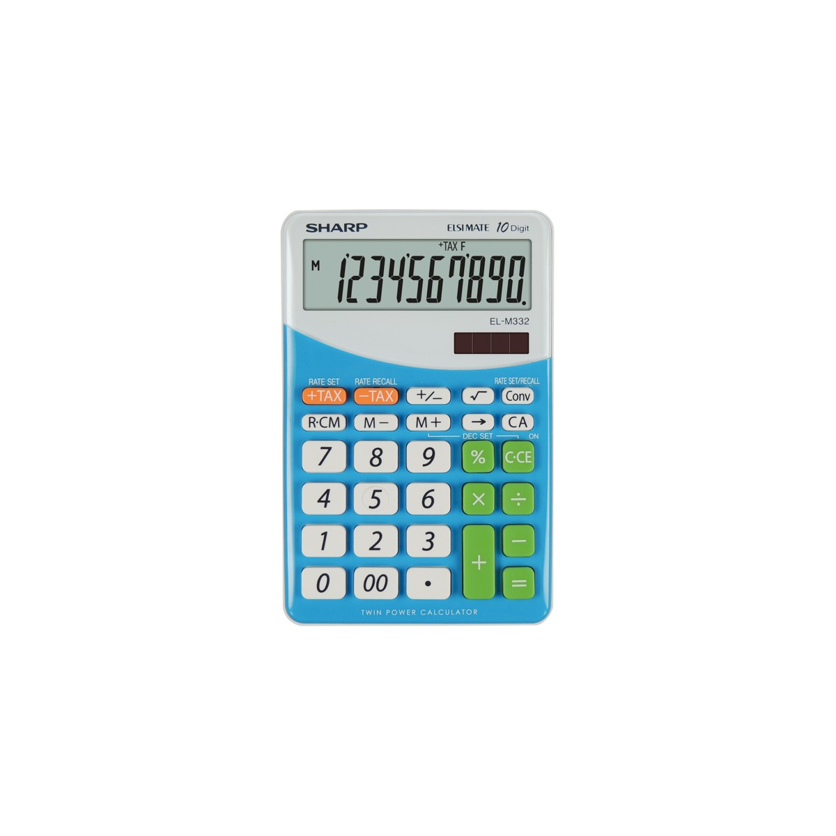 Sharp EL M332 BBL - BLU. Fattore di forma: Desktop, Tipo: Calcolatrice finanziaria. Cifre: 10 cifre, Righe di testo: 1 linee. Convertitore di valute. Alimentazione: Batteria/Solare. Colore del prodotto: Blu