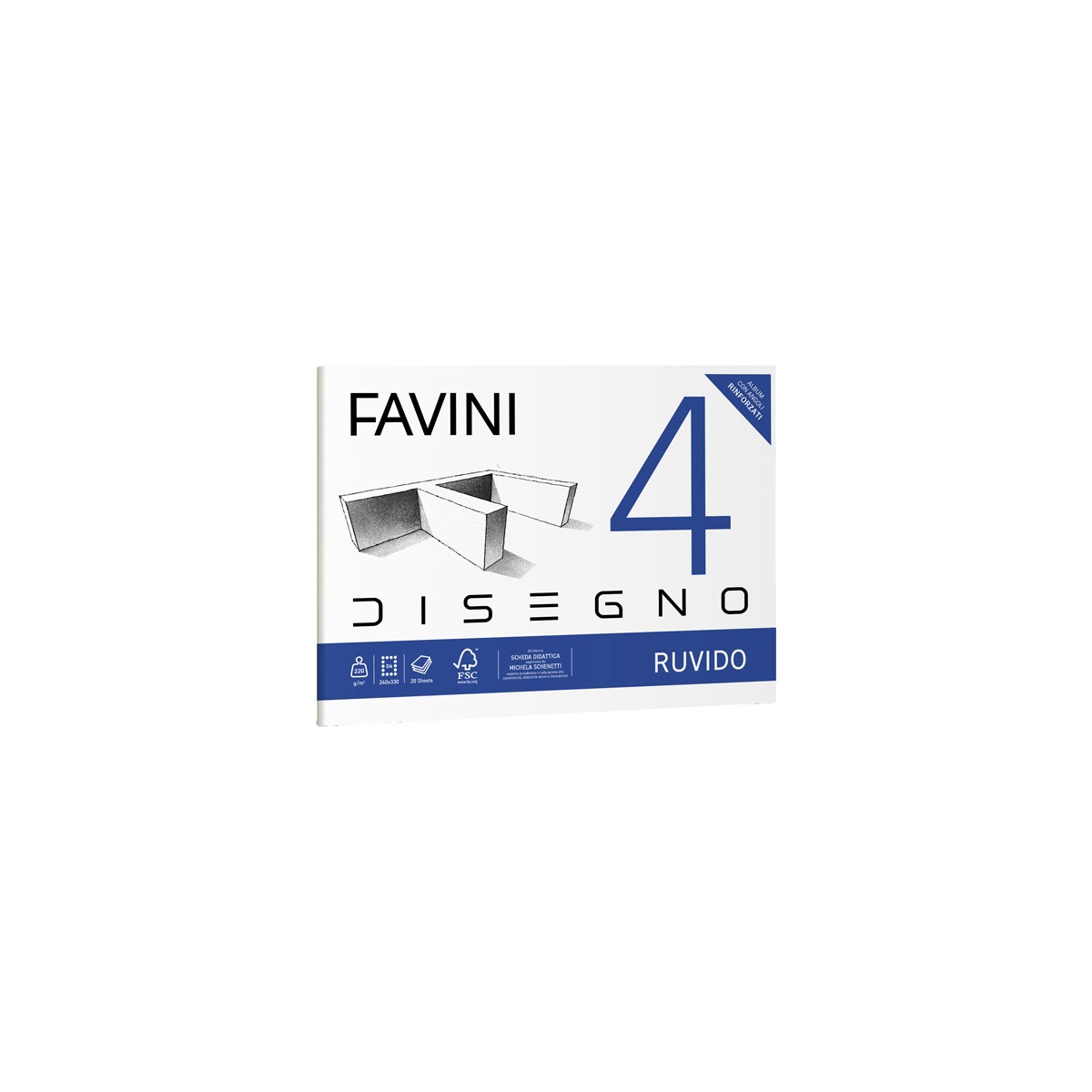 Favini A168504. Tipo: Blocco di carta da disegno, Quantità di fogli: 20 fogli, Peso medio: 220 g/m². Larghezza: 240 mm, Profondità: 330 mm. Certificati di sostenibilità: Forest Stewardship Council (FSC), Non contiene: Cloro