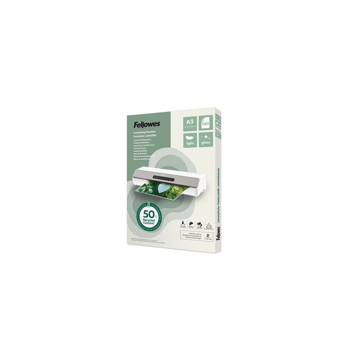 Fellowes 100142988. Finitura della superficie: Lucido, Formato: A3, Sistema di laminazione: Termico. Larghezza: 426 mm, Profondità: 1 mm, Altezza: 303 mm. Quantità per pacco: 100 pz