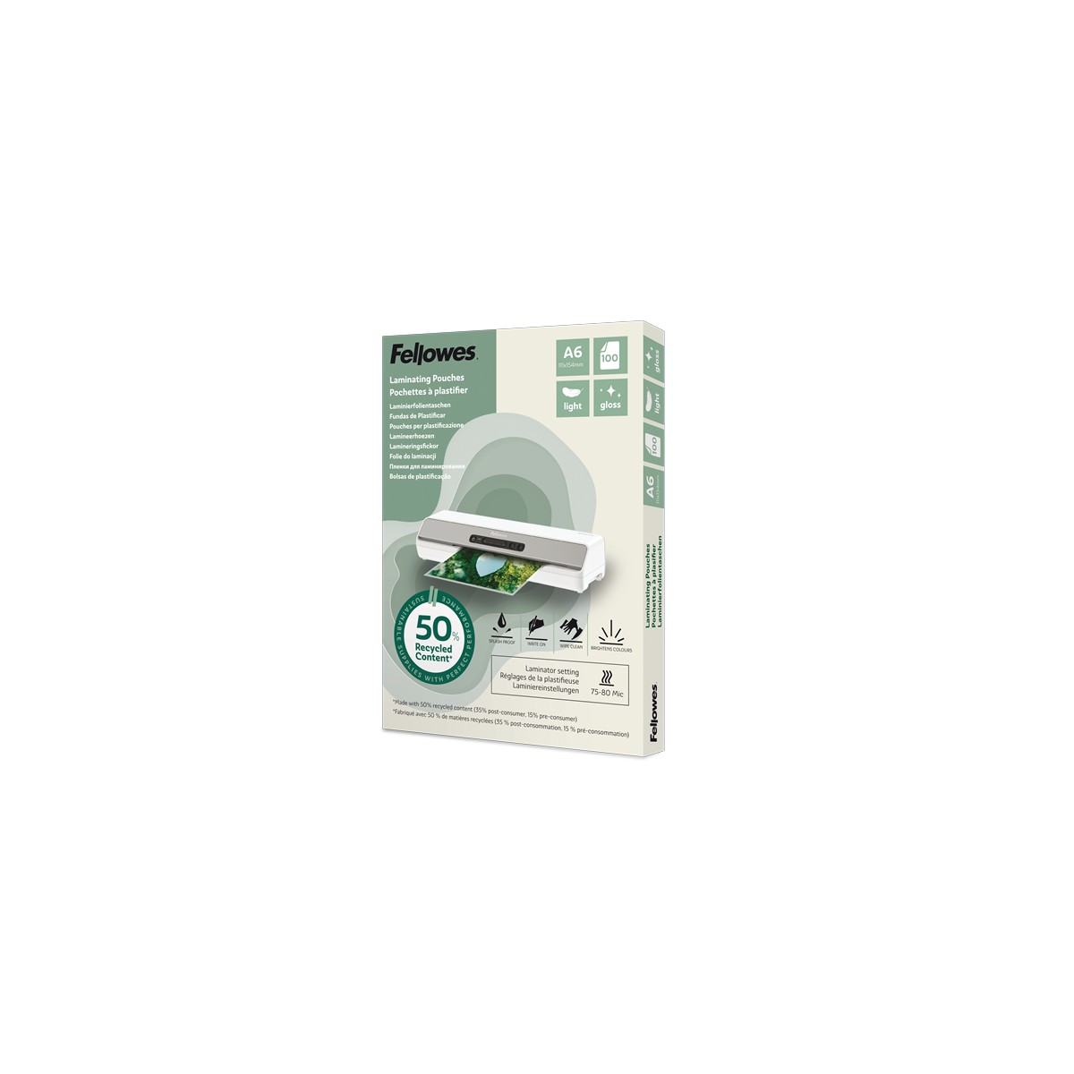 Fellowes 100143441. Finitura della superficie: Lucido, Formato: A6, Sistema di laminazione: Termico. Larghezza: 111 mm, Profondità: 1 mm, Altezza: 154 mm. Quantità per pacco: 100 pz