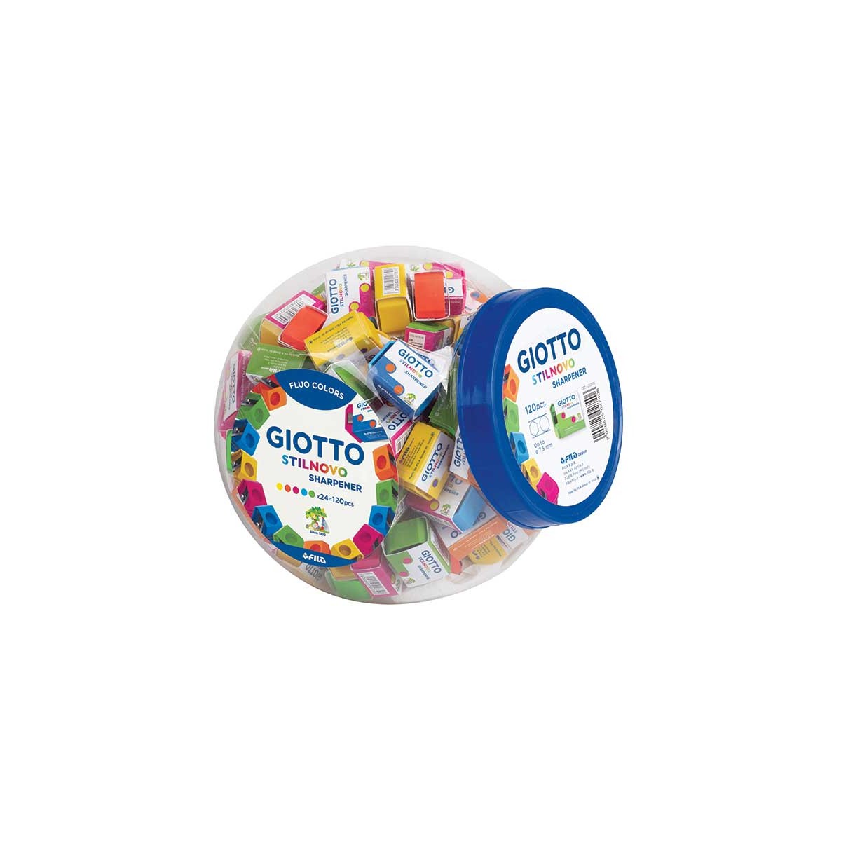 Giotto Fluo. Tipo: Temperamatite manuale, Colore del prodotto: Blu, Fucsia, Verde, Arancione, Giallo, Materiali: Plastica. Quantità per pacco: 120 pz