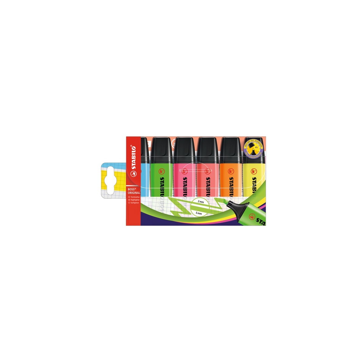 STABILO BOSS ORIGINAL. Quantità per pacco: 6 pz, Colore penna: Multi, Tipo di tappo: Punta smussata. Larghezza imballo: 19 mm, Profondità imballo: 111 mm, Altezza imballo: 176 mm