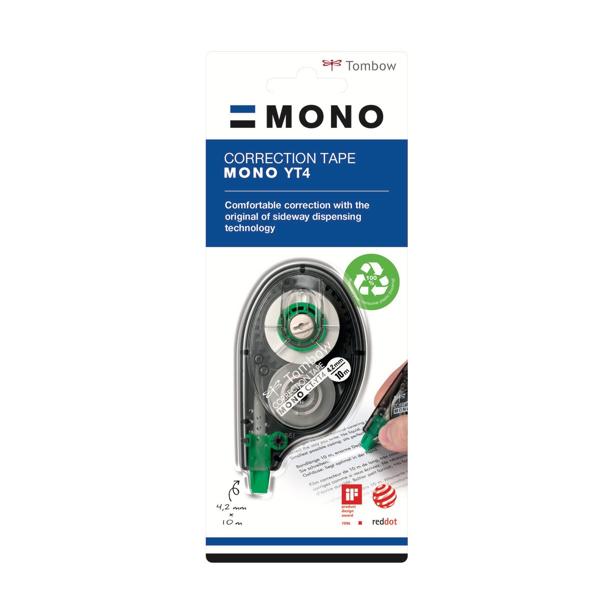 Tombow Mono YT4. Colore del prodotto: Bianco, Lunghezza nastro: 10 m, Ampiezza nastro: 4,2 mm. Tipo di imballo: Blister. Quantità per pacco: 1 pz