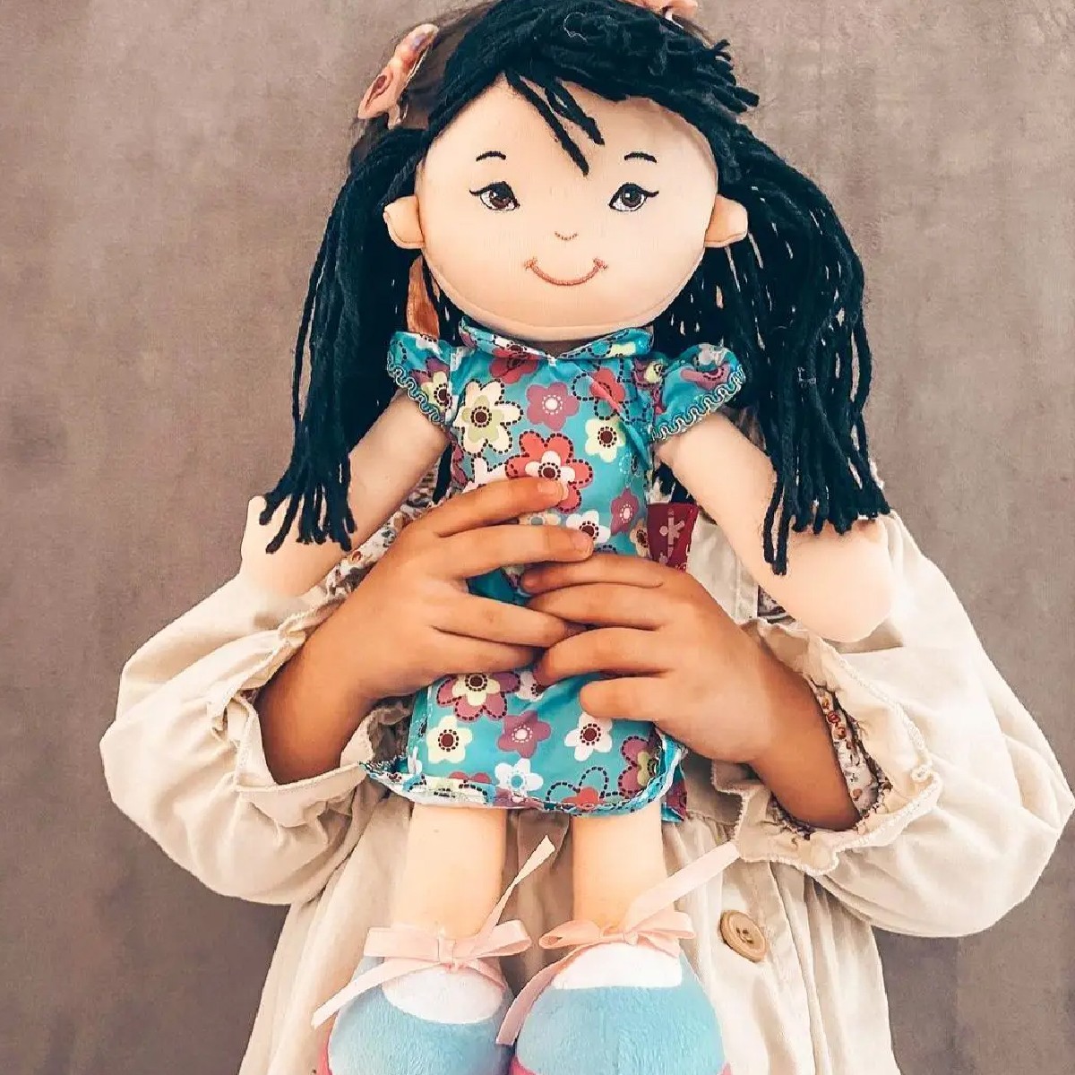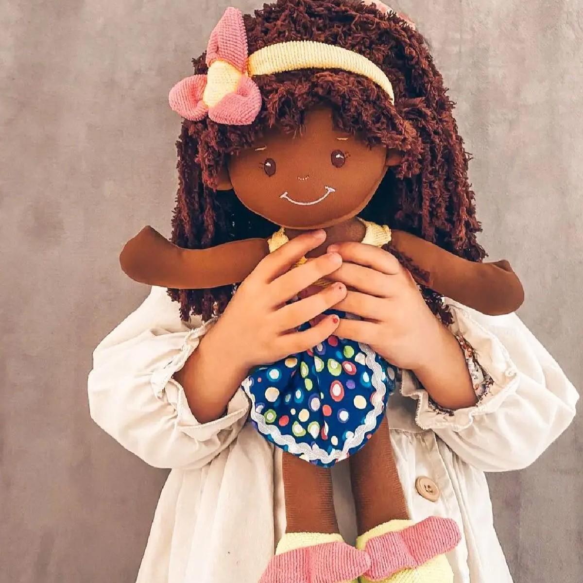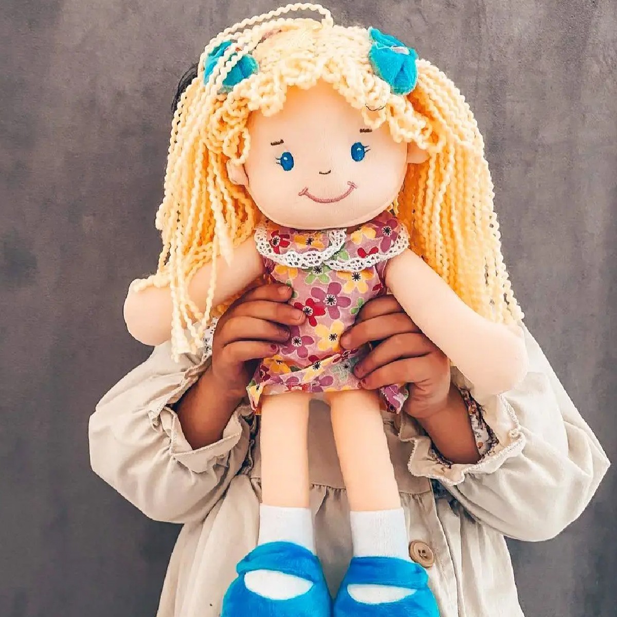 Un set di quattro bambole in tessuto con imbottitura in ovatta soffice, perfette per stimolare la creatività e il linguaggio attraverso il gioco simbolico.