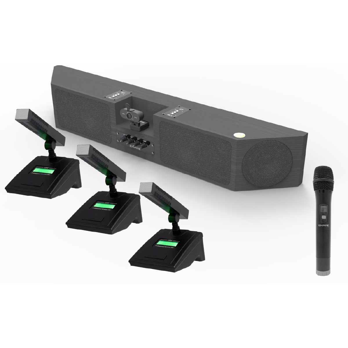Soundbar con webcam e 4 radio microfoni da tavolo inclusi - Ideale per gruppi di lavoro o sale meeting - Pile microfono Escluse