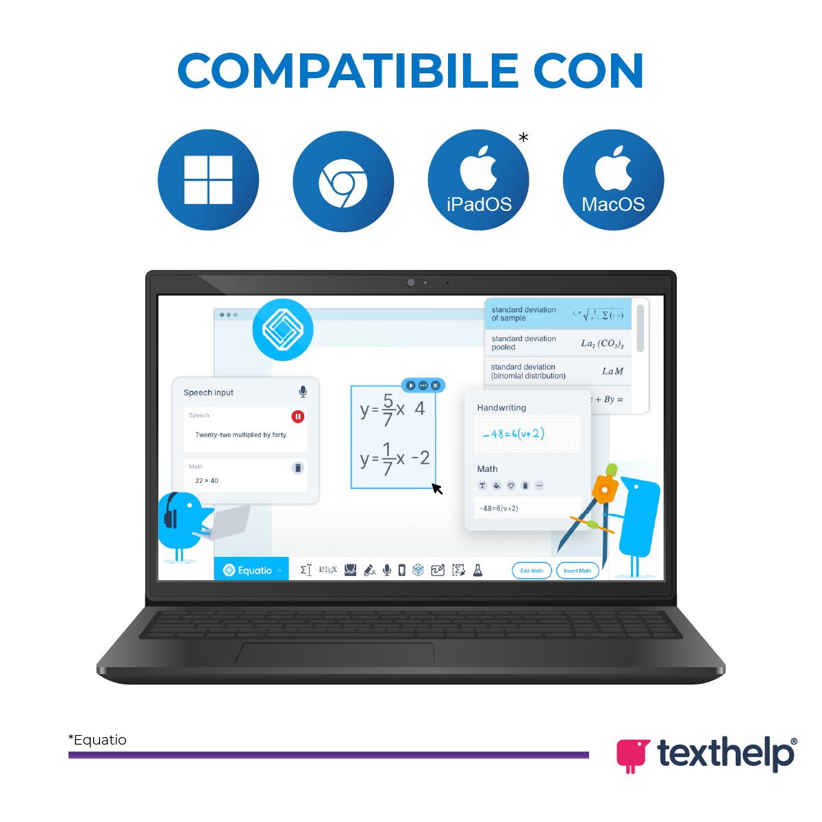 Equatio è un software specifico per le materie STEM, include infatti strumenti per scrivere linguaggio matematico con tastiera, manualmente su schermo touch, dettare linguaggio matematico, strumenti come la calcolatrice, o la lavagna bianca, strumenti di chimica e per grafici. Si integra in Google Moduli.