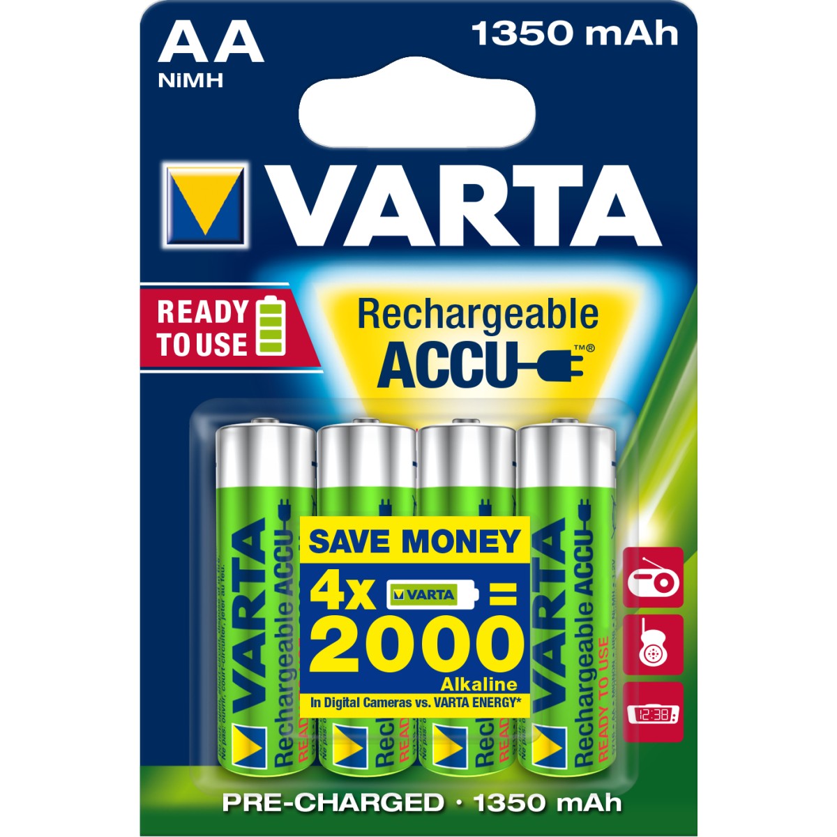 Varta Ready2Use HR06 1350 mAh. Tipo batteria: Batteria ricaricabile, Dimensioni della batteria (o delle batterie): Stilo AA, Tecnologia batteria: Nichel-Metallo Idruro (NiMH)
