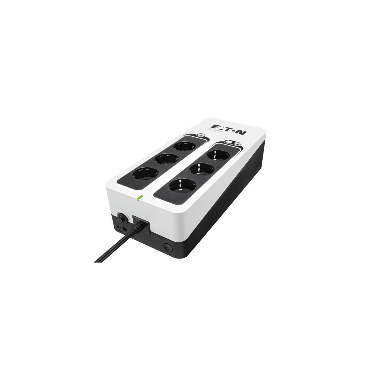 Eaton 3S450D. Topologia UPS: Standby (Offline), Potenza in uscita: 0,45 kVA, Potenza in uscita: 270 W. Tipo di uscita AC: Tipo F, Quantità prese AC: 6 presa(e) AC. Tecnologia batteria: Acido piombo (VRLA). Colore del prodotto: Nero, Bianco, Lunghezza cavo: 1,5 m. Certificazione: CE/EAC/Ukr/Cm/CB report